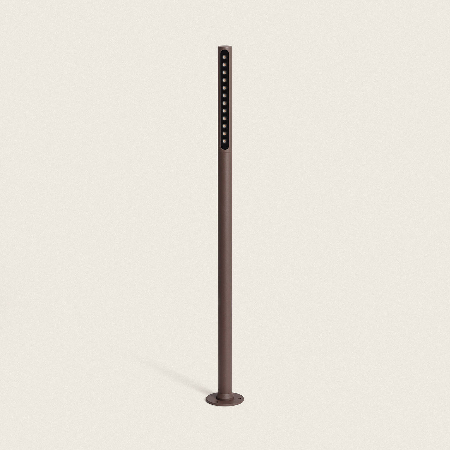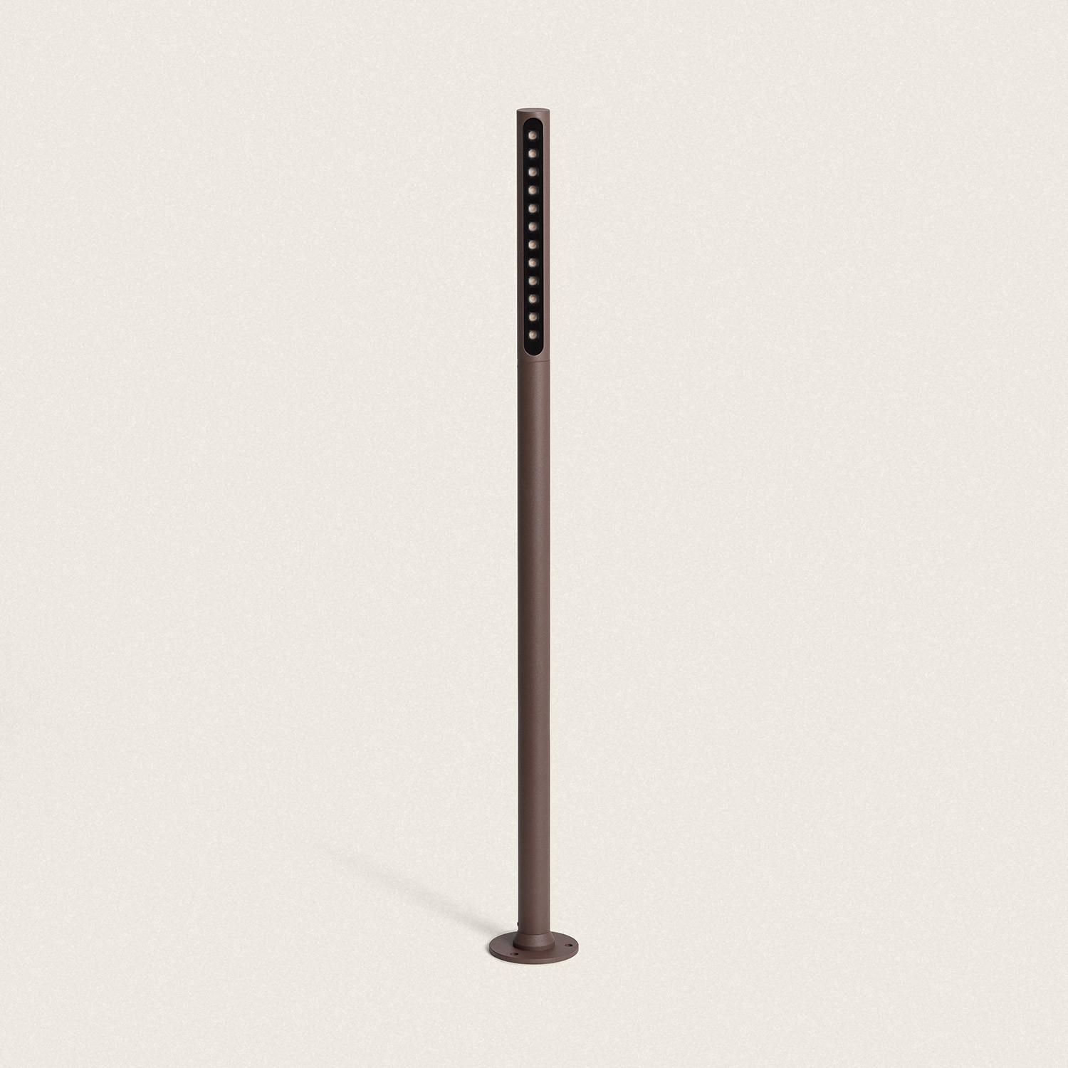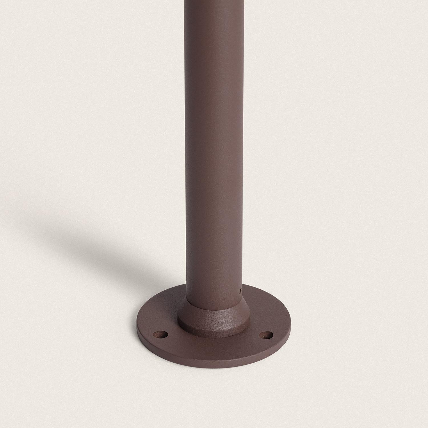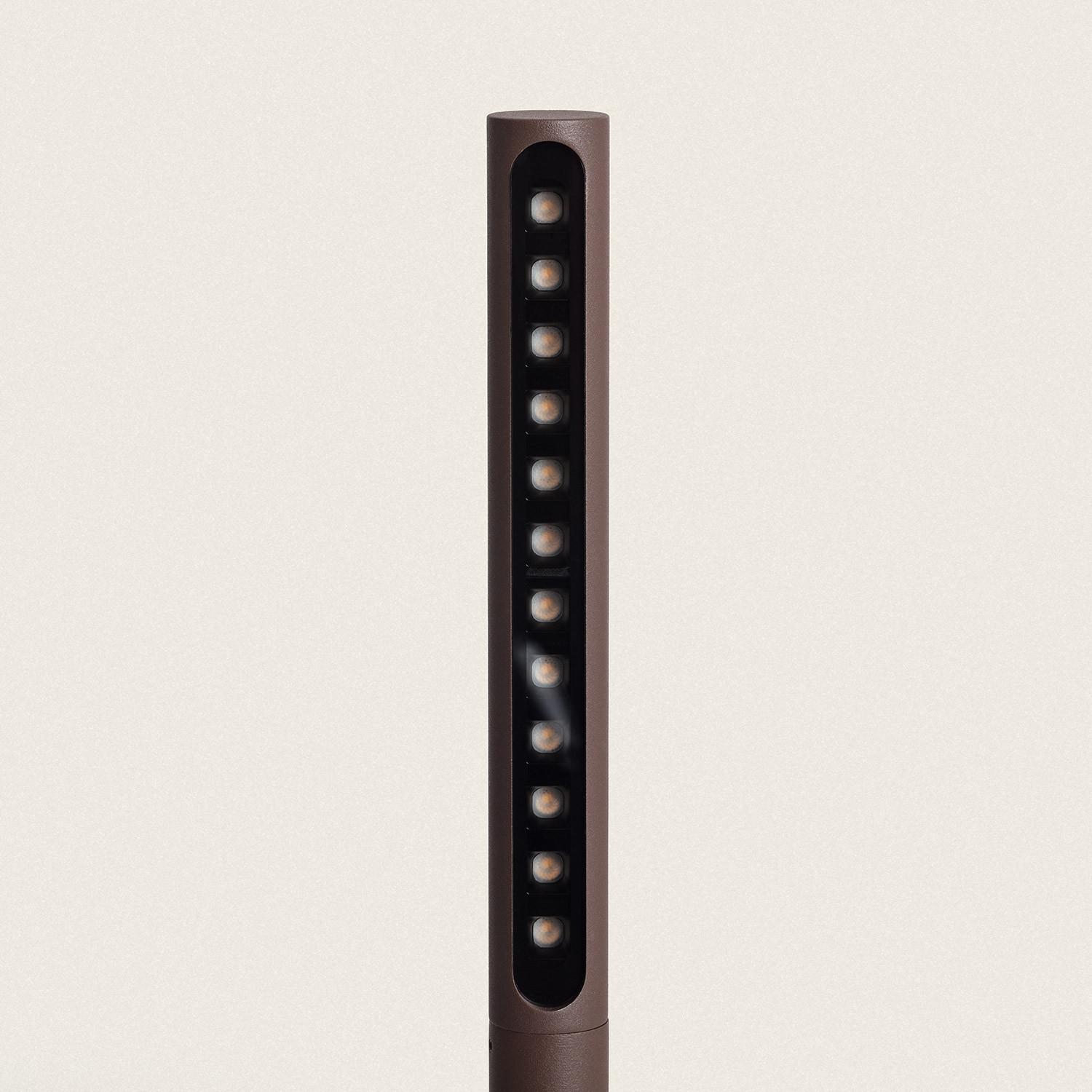 Sa silhouette fine et son diamètre discret de 85 mm permettent une intégration harmonieuse parmi végétation et dallage. La finition rouille apporte une patine contemporaine qui se fond naturellement dans les ambiances extérieures, valorisant les éléments paysagers sans dominer l’espace.