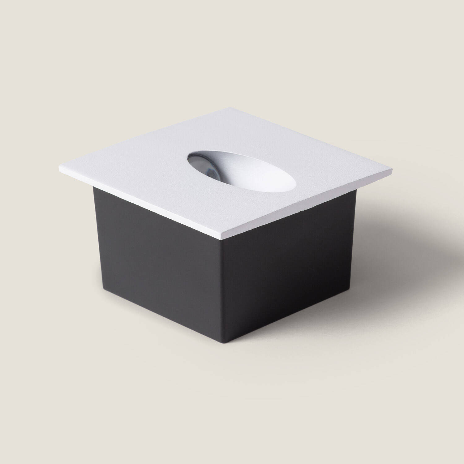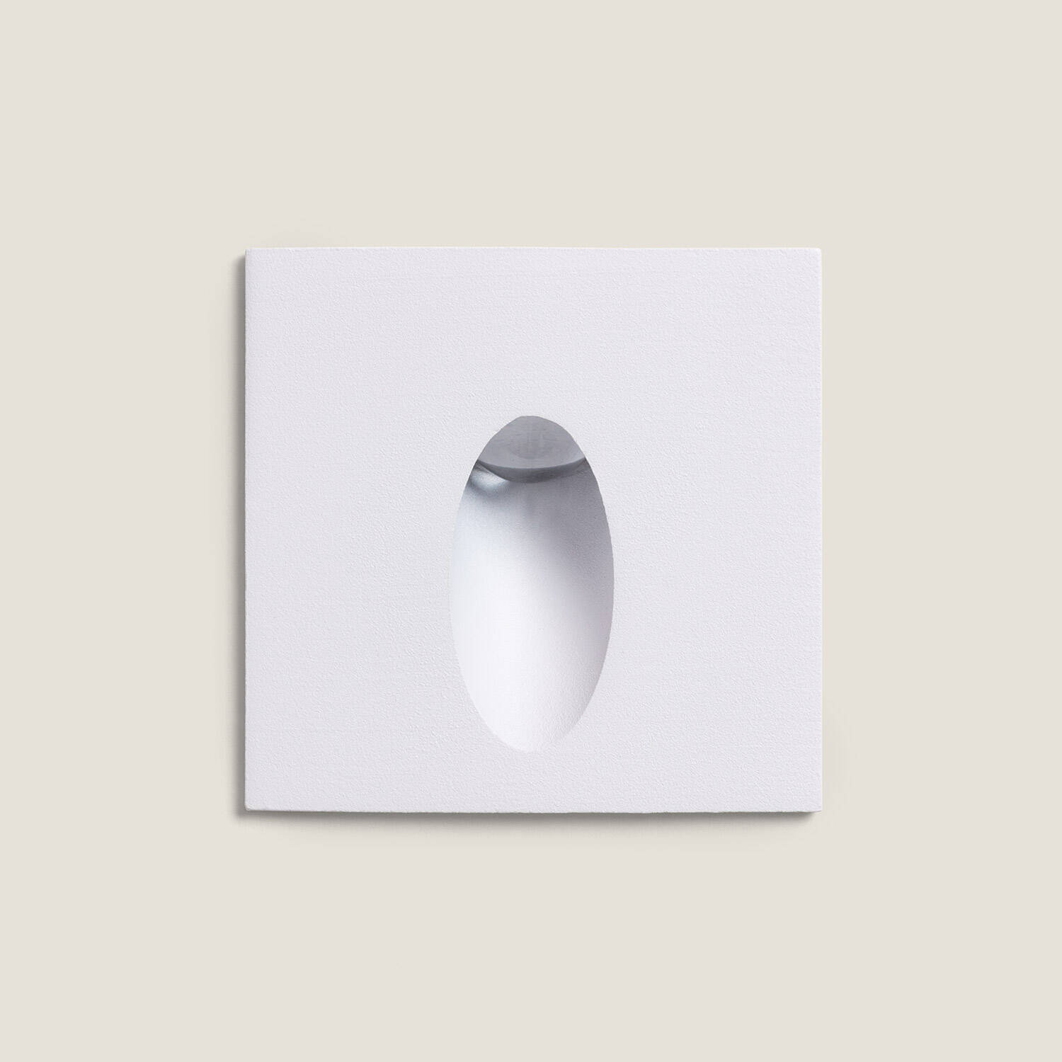 Son visage carré blanc avec ouverture ovale crée une esthétique contemporaine raffinée. Sa face lisse s’intègre aisément aux revêtements de pierre ou béton, offrant une présence mesurée et cohérente qui ne rompt pas l’équilibre visuel des façades tout en soulignant les lignes architecturales.