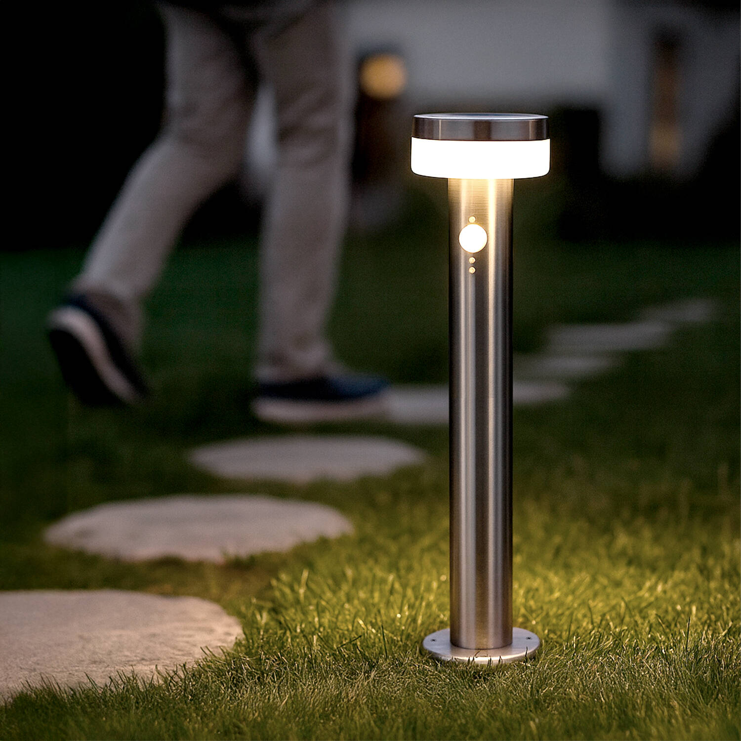 La balise intègre un détecteur PIR avec un angle de détection d'environ 110° et un angle d'ouverture de 120º, pour une portée maximale d'environ 10 m. Ce détecteur active l'éclairage quand une présence est détectée, idéal pour éclairer les allées et points d'accès extérieurs.