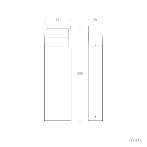 La balise mesure 800 mm de hauteur, 140 mm de largeur et 76 mm de profondeur pour un poids d'environ 2,45 kg, ce qui en fait un élément discret et stable pour baliser un chemin ou une terrasse. Le boîtier en aluminium finition rouille est visible sur les images et le câblage s'effectue par la base pour une installation propre.