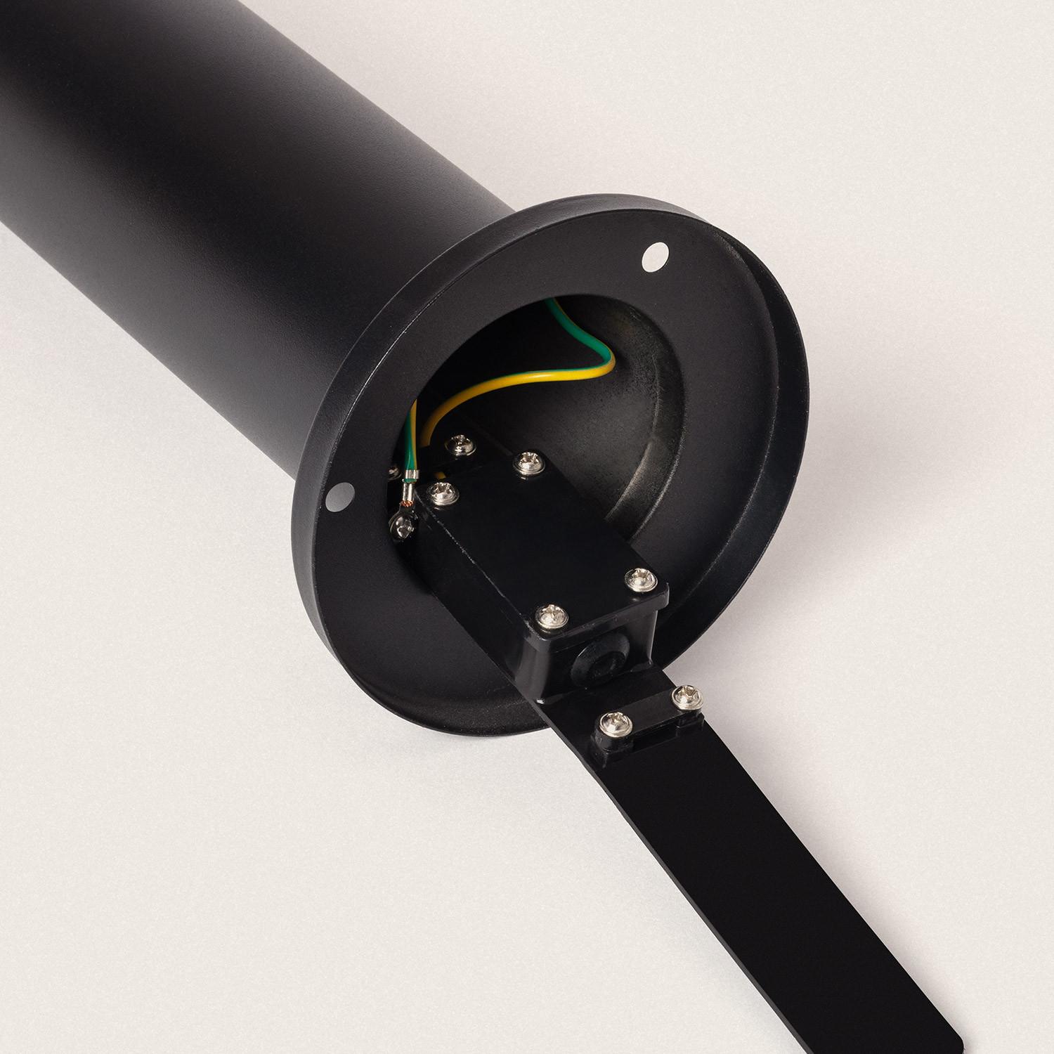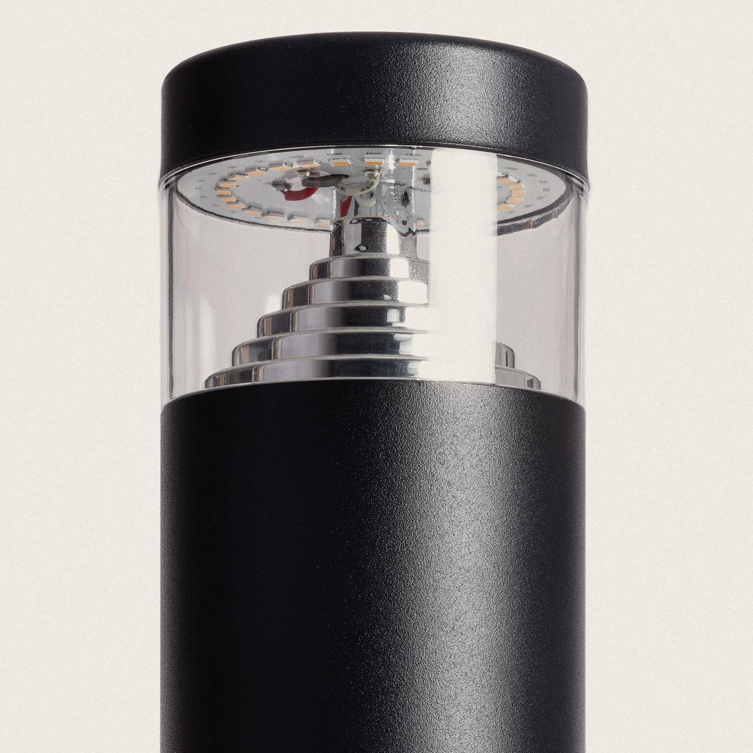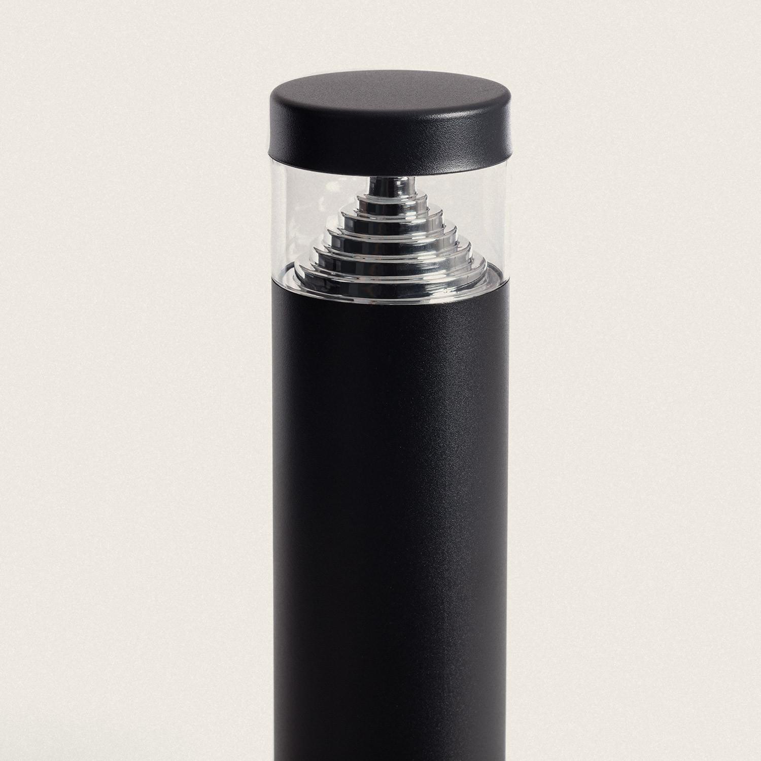 Le profil cylindrique de 120 mm de diamètre et la hauteur de 50 cm offrent une silhouette élégante et discrète. La finition noire mate associée à éléments inox confère un rendu contemporain, s’intégrant avec élégance aux lignes architecturales et aux ambiances paysagères.