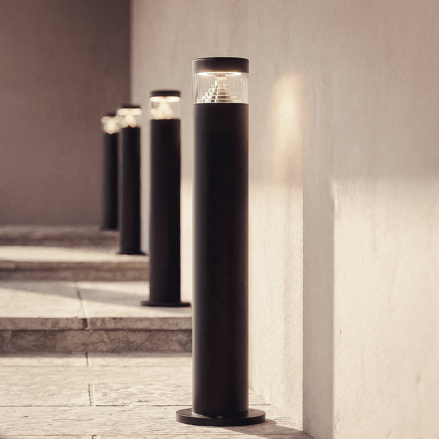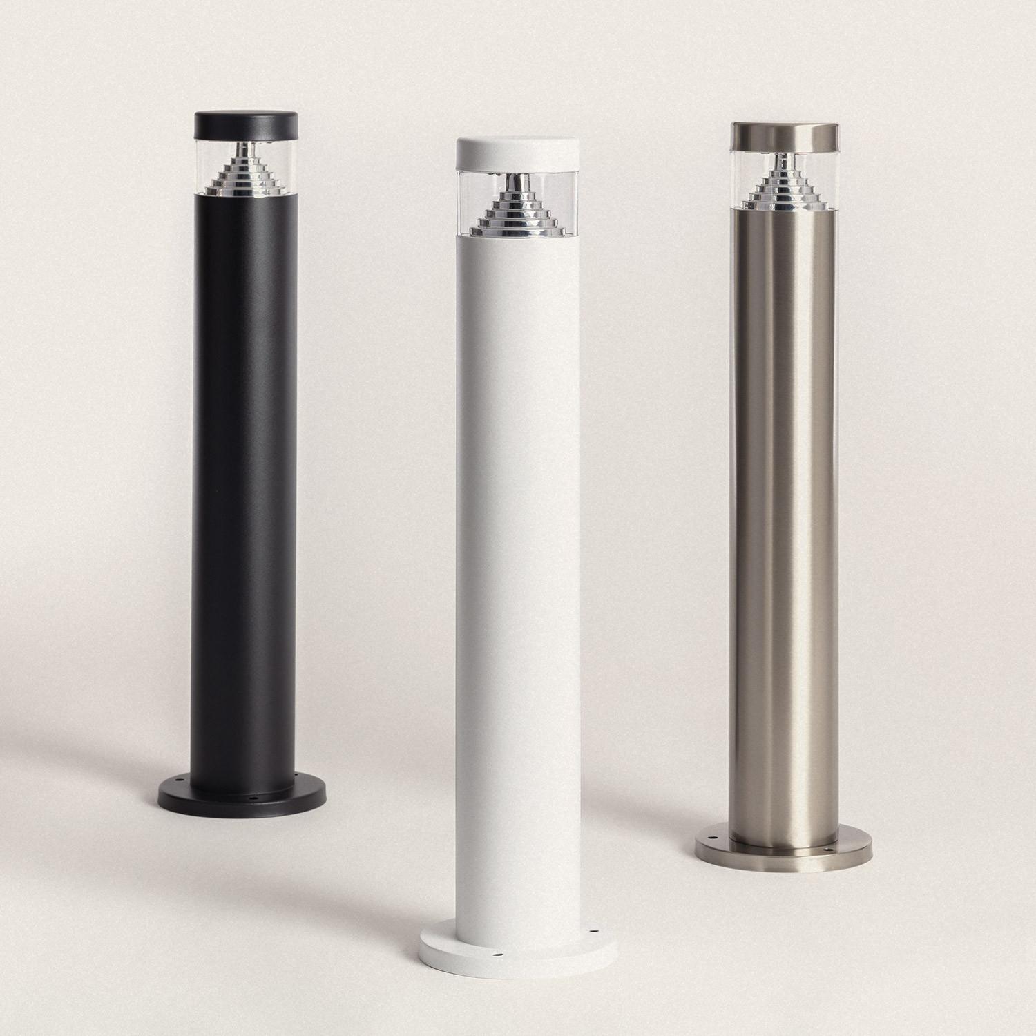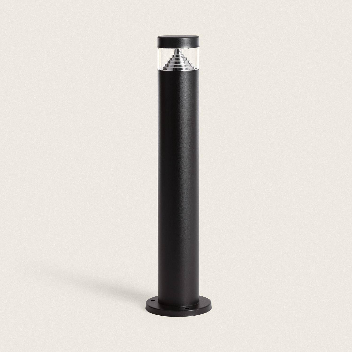 Le profil cylindrique de 120 mm de diamètre et la hauteur de 50 cm offrent une silhouette élégante et discrète. La finition noire mate associée à éléments inox confère un rendu contemporain, s’intégrant avec élégance aux lignes architecturales et aux ambiances paysagères.
