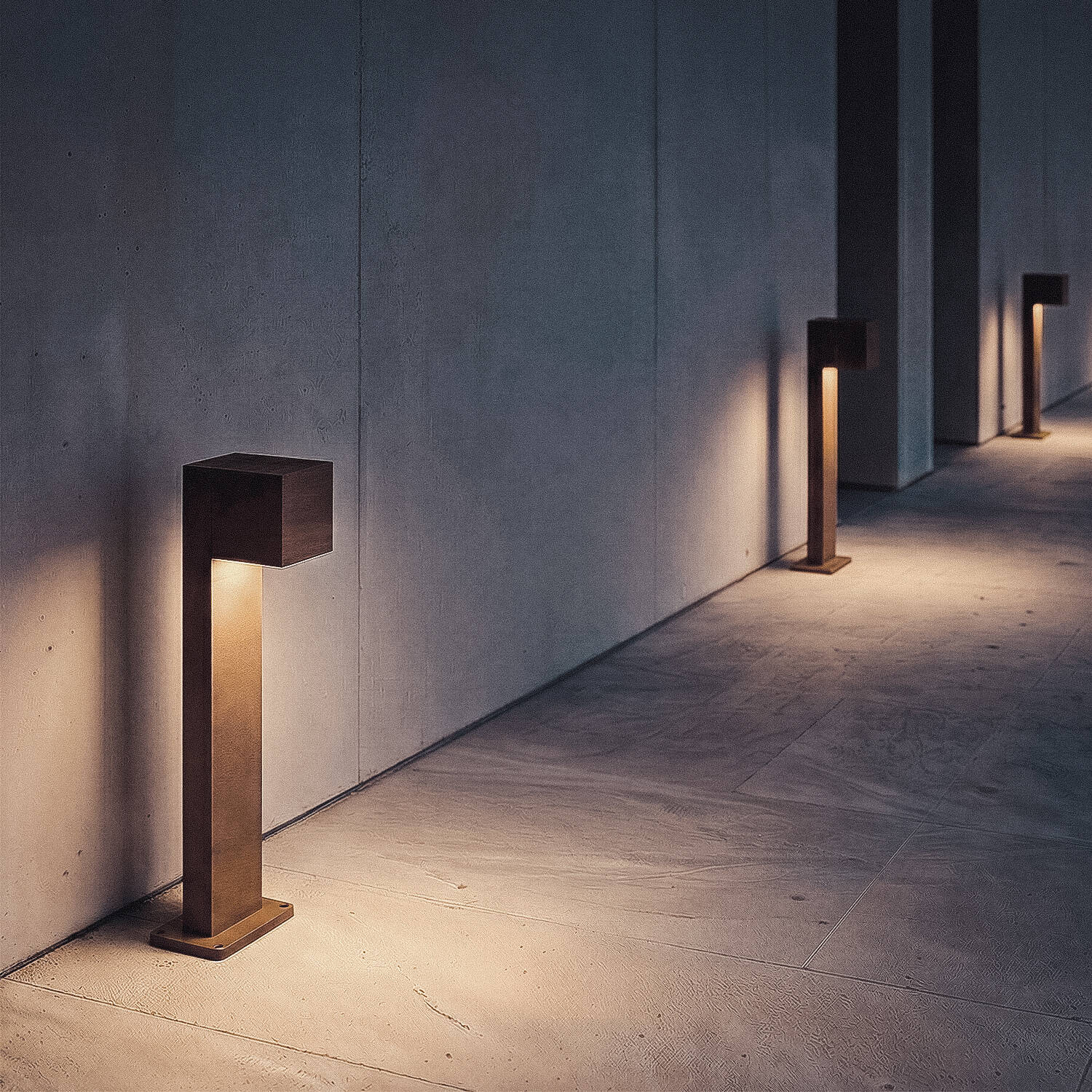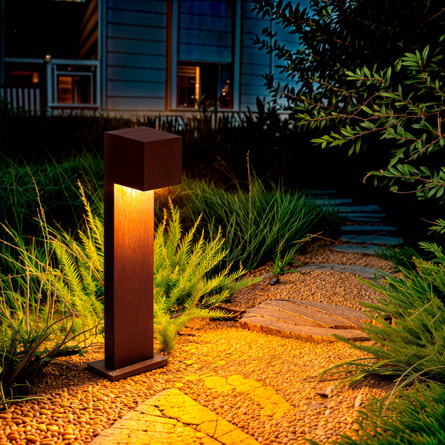 Son gabarit élancé de 50 cm et sa tête cubique produisent un éclairage indirect parfaitement adapté aux allées et parterres. La teinte rouille s’harmonise avec les matériaux extérieurs, créant une présence discrète mais remarquée qui respecte l’esthétique du jardin, tout en conservant un aspect contemporain.