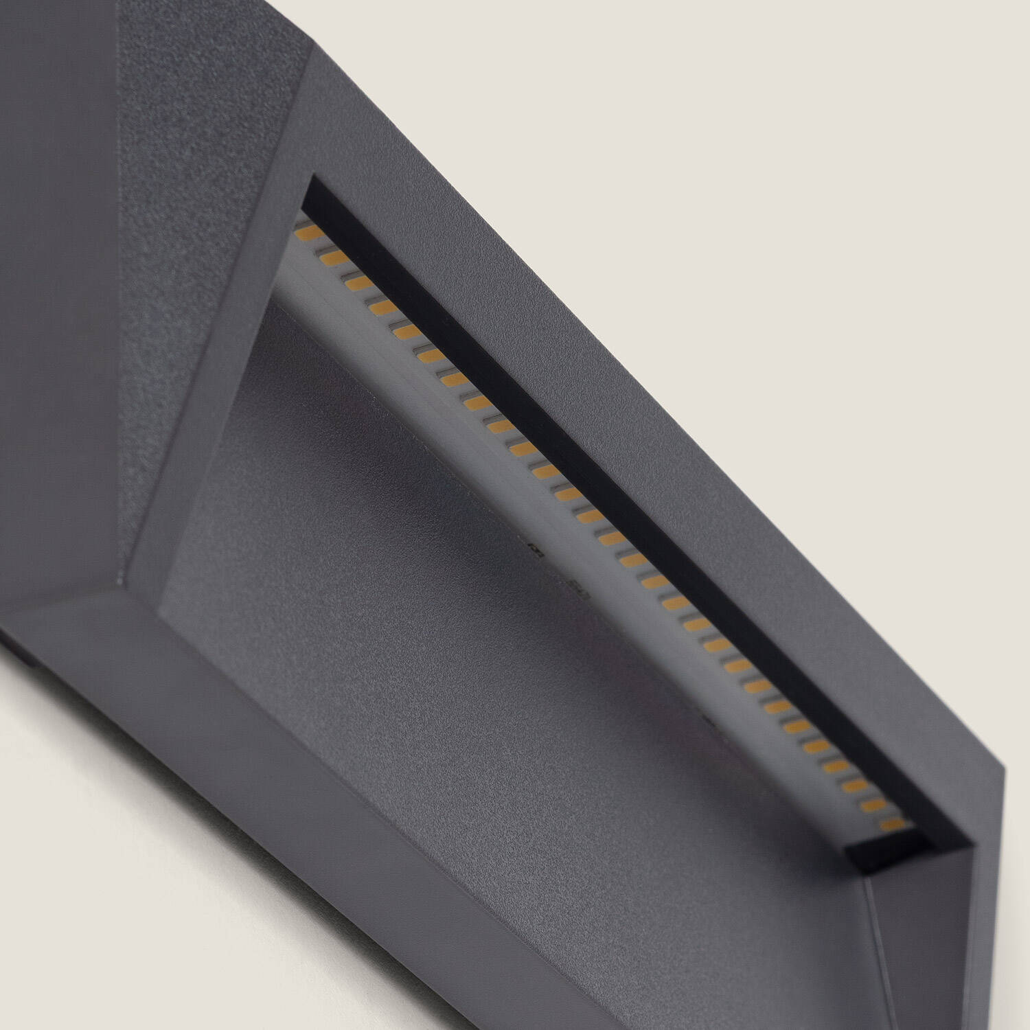 Sa silhouette basse et son finition en polycarbonate anthracite offrent un rendu premium sans ostentation. Les formes géométriques créent un relief élégant qui se fond sur les façades modernes, apportant une touche minimaliste tout en respectant l’harmonie des matériaux environnants.