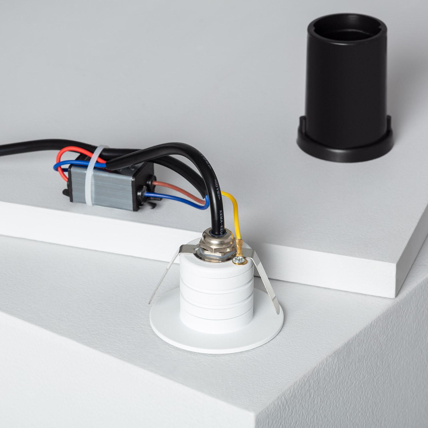Percez un trou d'encastrement Ø43 mm et prévoyez une profondeur utile d'environ 67 à 68 mm. Le produit se fixe en mural encastré comme sur les photos. Coupez l'alimentation avant toute intervention et confiez le branchement 220-240V AC à un électricien qualifié. Le driver est inclus et doit être logé derrière la paroi ou dans la cavité dédiée.
