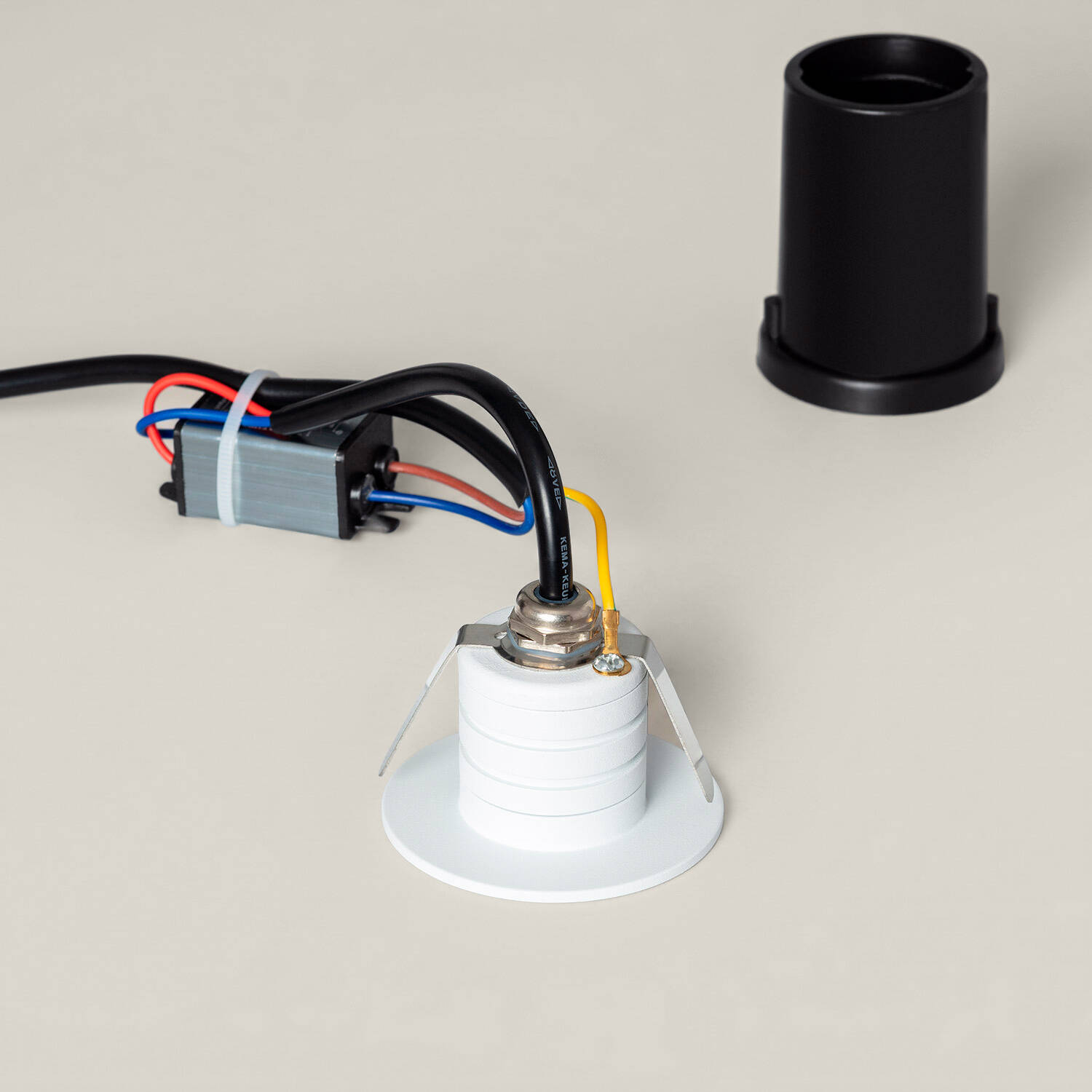 La balise est conçue pour un montage encastré mural propre, avec un diamètre compact de 63 mm et une découpe adaptée Ø43 mm. Le boîtier fourni et le driver inclus simplifient le raccordement sur réseau 220–240V, offrant une intégration discrète et professionnelle et une finition soignée.