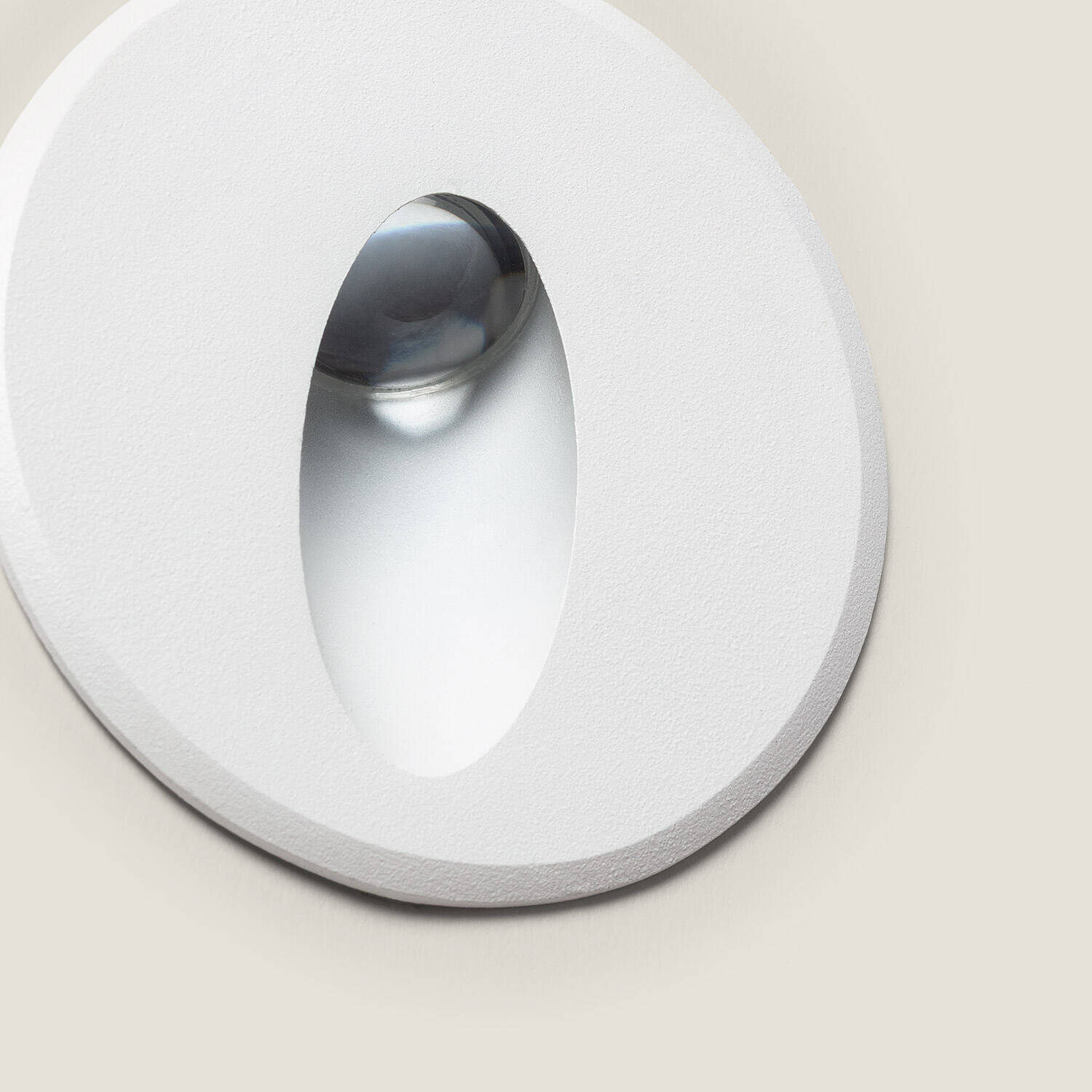 Son visage rond et bombé, finition blanche en aluminium, offre un rendu élégant et discret qui s’intègre naturellement aux façades contemporaines ou classiques. Son diamètre compact facilite l’encastrement mural, garantissant une ligne propre et une installation soignée sans sacrifier la qualité lumineuse.