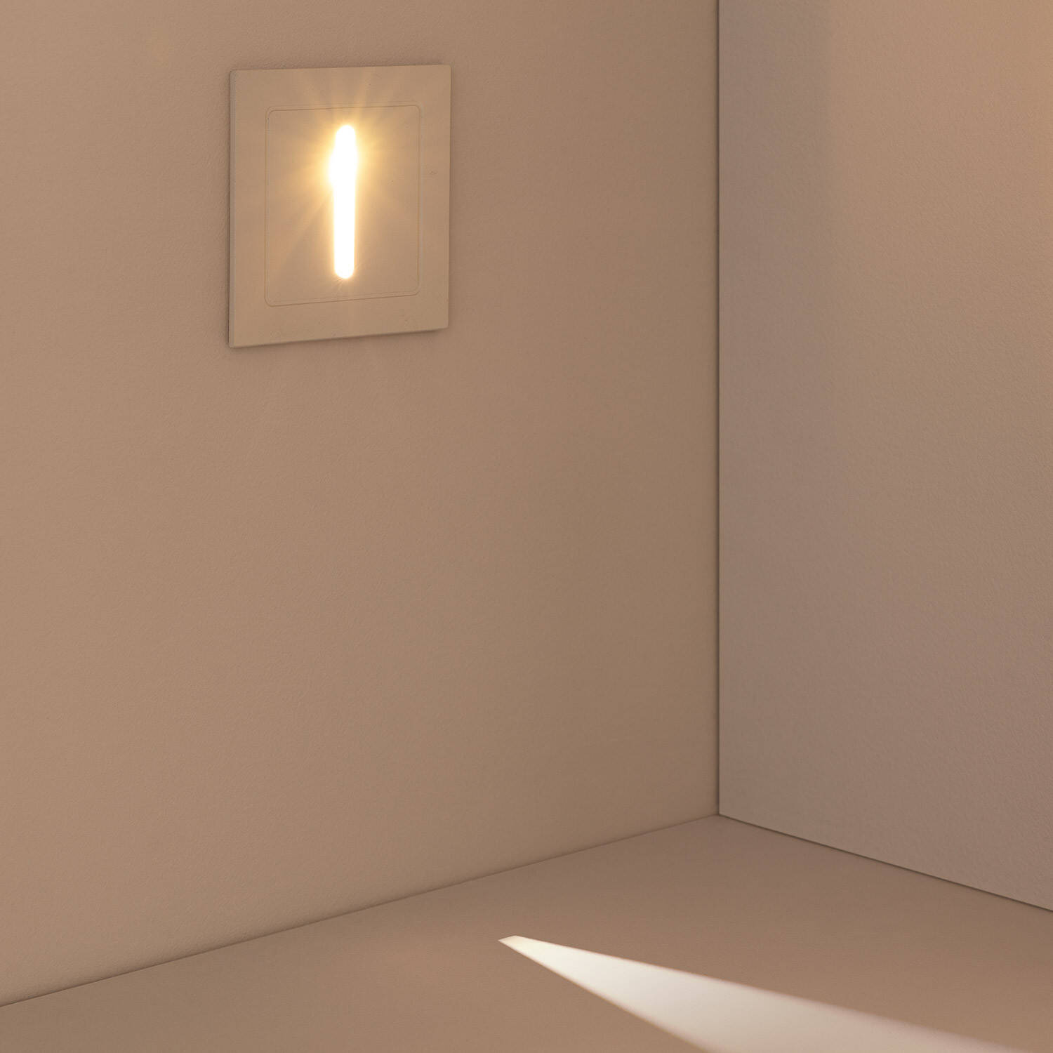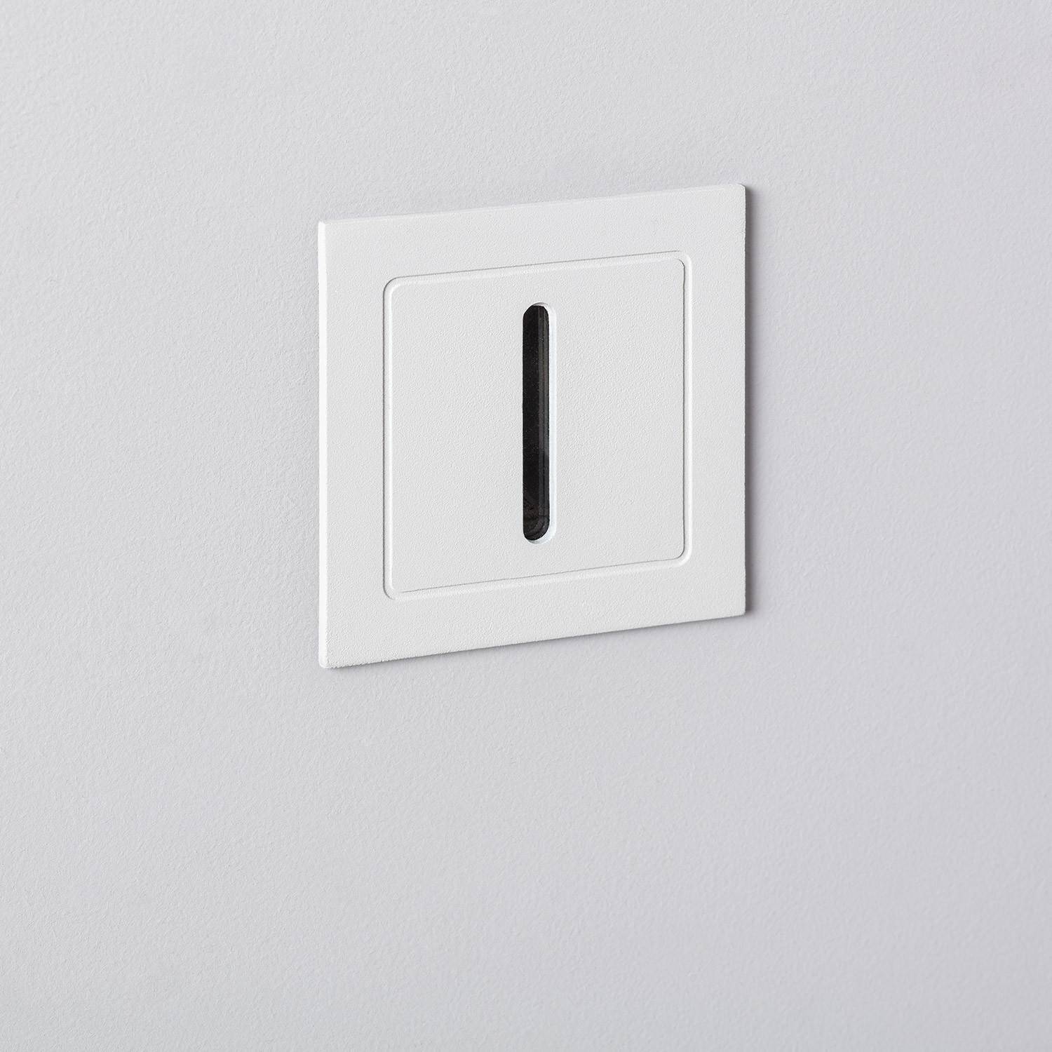 Le boîtier en aluminium peint blanc s’intègre au nu du mur et affiche des lignes pures, apportant une signature contemporaine sans ostentation. L’implantation encastrée garantit un rendu soigné et protège l’installation pour une intégration harmonieuse dans tous projets d’éclairage extérieur.