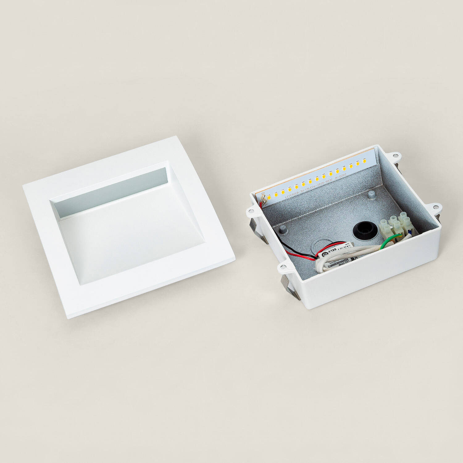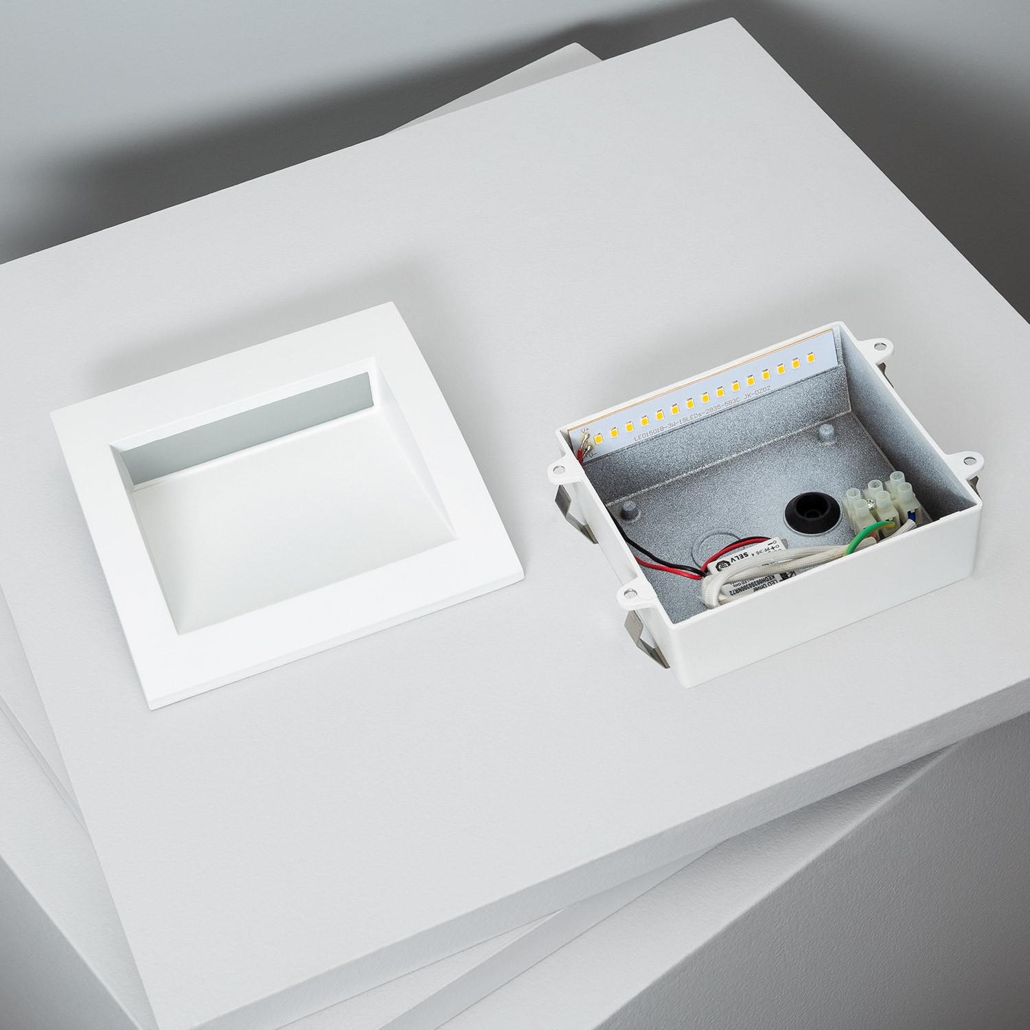 Conçue pour une installation encastrée au mur, la balise se pose proprement dans les découpes murales et se raccorde directement au secteur sans transformateur. Son format carré et ses finitions blanches permettent une intégration discrète, idéale pour des installations neuves ou en rénovation soignée.