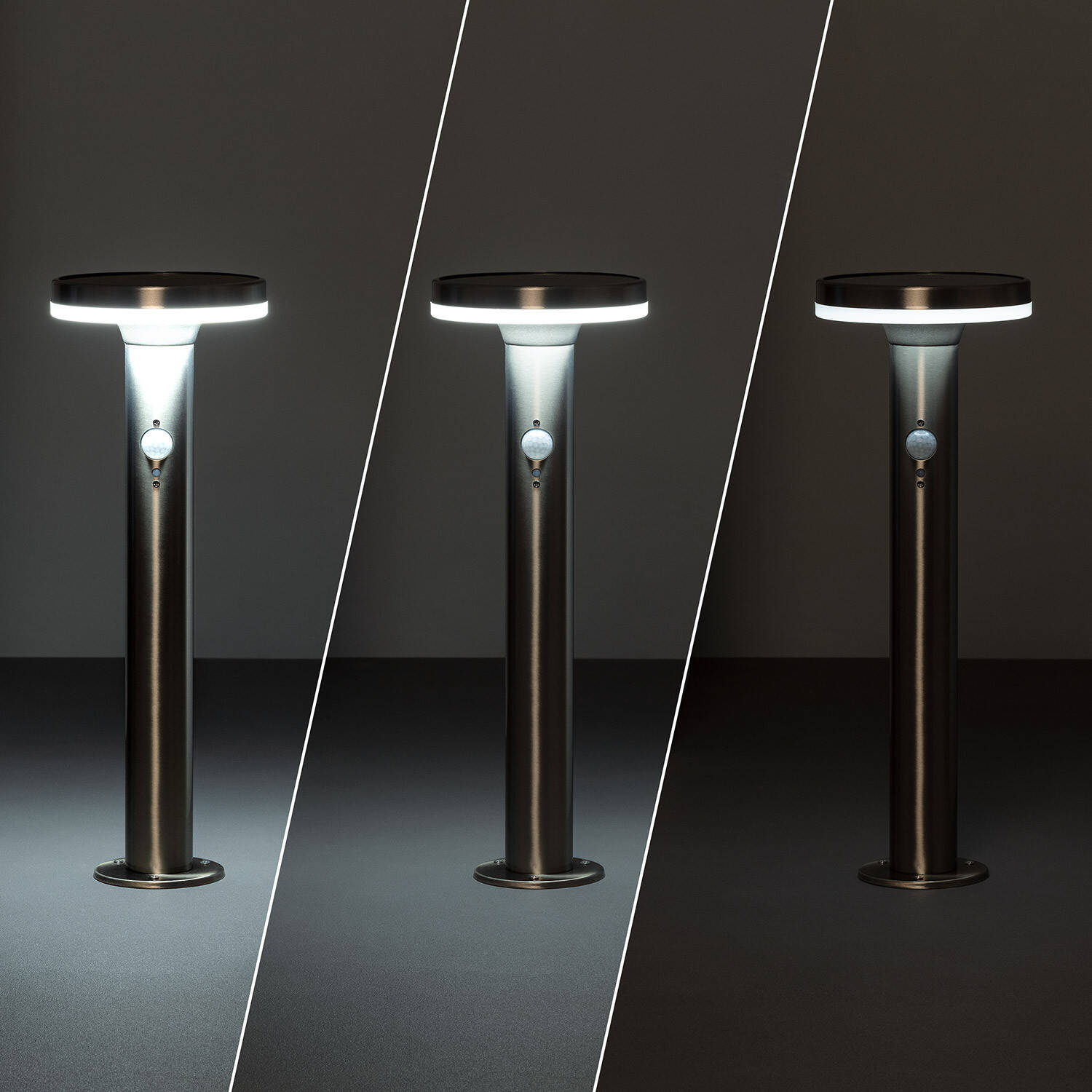 Le détecteur PIR intégré déclenche l'éclairage lorsqu'un mouvement est détecté la nuit, offrant une lumière instantanée et sécurisante pour l'éclairage extérieur. Le capteur est clairement visible sur le fût de la balise et un petit bouton permet d'activer ou de désactiver la fonction selon vos besoins.
