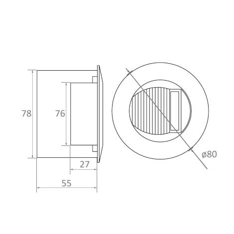 Son dessin rond et compact (Ø80 mm, longueur 58 mm) offre une présence discrète en façade. L’encastrement sobre crée un point lumineux intégré, idéal pour conserver l’esthétique de vos murs tout en assurant une finition premium et durable grâce à l’aluminium.