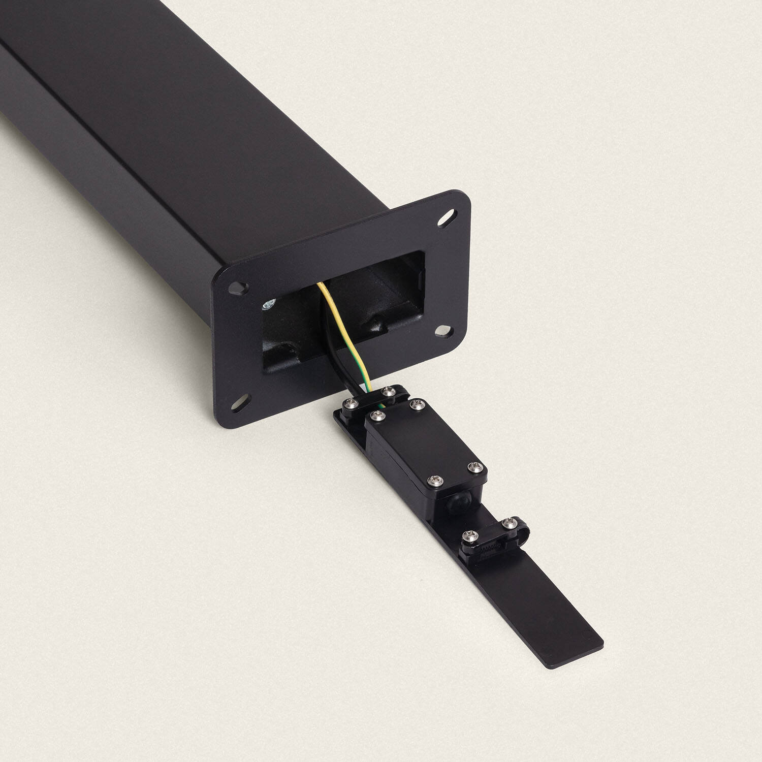 L'installation se fait par fixation de la platine de base visible sur le produit, à l'aide de vis ou chevilles adaptées au support. Le câblage passe dans le pied et un bornier accessible permet la connexion au 220 240V AC. Pour votre sécurité et la conformité électrique, nous recommandons le recours à un électricien qualifié.