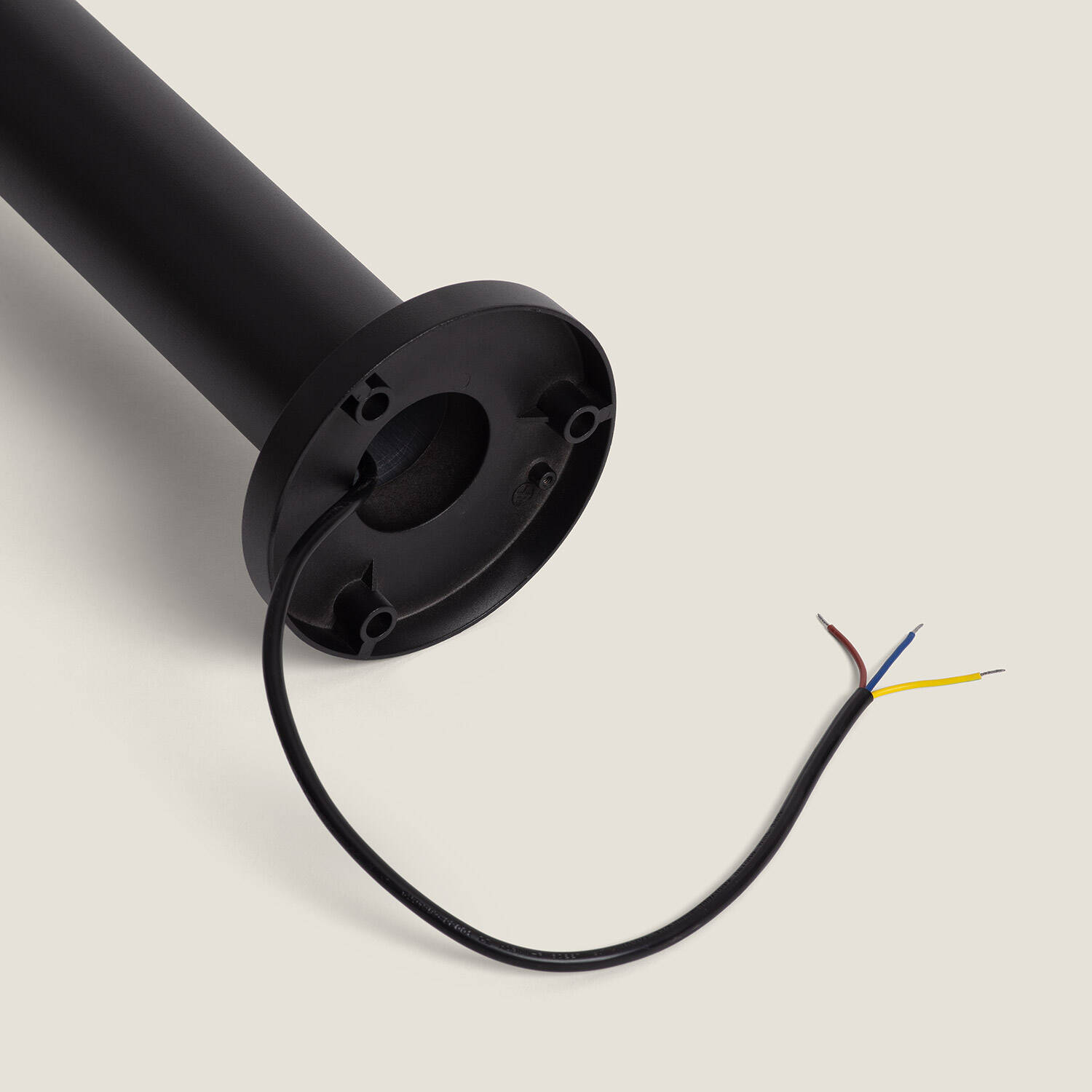 La balise se fixe au sol par sa platine de base munie de trous de fixation visibles sur les photos. Elle se raccorde au réseau 220-240 V AC via le câble intégré avec phase, neutre et terre. Pour une installation sûre et conforme, faites appel à un électricien qualifié qui utilisera des chevilles et vis adaptées à votre surface et garantira l'étanchéité des raccordements.