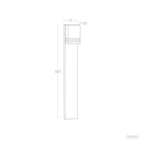 La balise mesure 500 mm de hauteur avec une tête d'environ 120 mm de large et 75 mm de profondeur. Pour un éclairage uniforme d'un chemin extérieur prévoyez généralement un espacement de 1,5 à 3 mètres selon l'intensité de l'ampoule et l'effet recherché. Testez le positionnement avant fixation définitive.