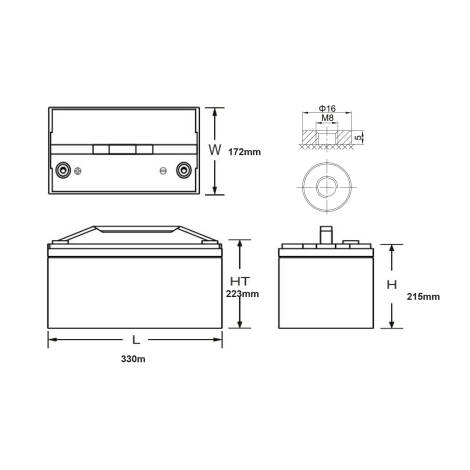 Les dimensions indiquées sont 330 mm de longueur 172 mm de largeur et 223 mm de hauteur. Le poids est de 11.7 kg. Vérifiez ces mesures pour vous assurer que la batterie rentre dans votre caisson et laissez un peu d'espace pour les câbles et la ventilation.
