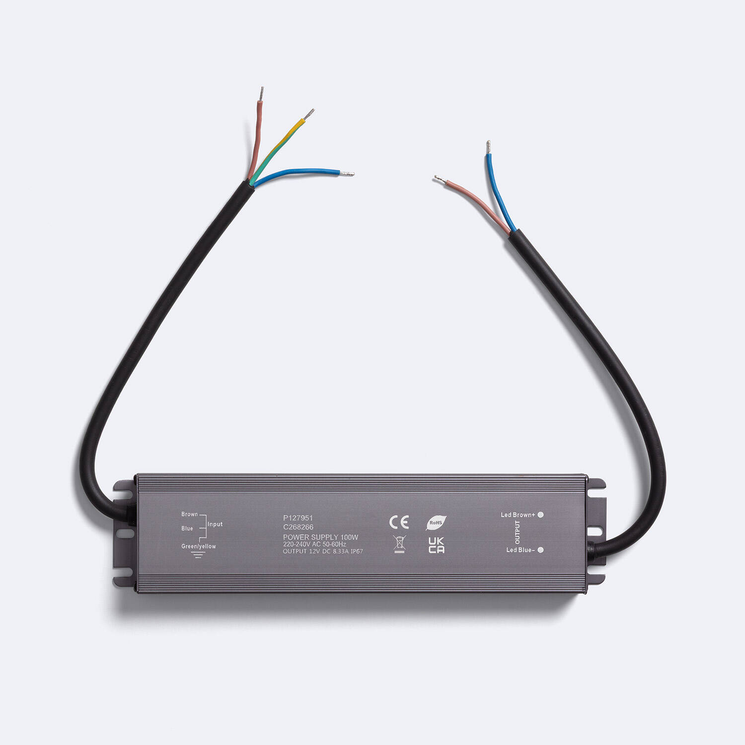 La sortie 12V DC délivre une puissance continue de 100 W et un courant stable jusqu’à 8,33 A, assurant un éclairage uniforme et un fonctionnement fiable des systèmes 12V. Grâce à un facteur de puissance élevé et à une plage d’entrée élargie, l’efficacité reste optimale.