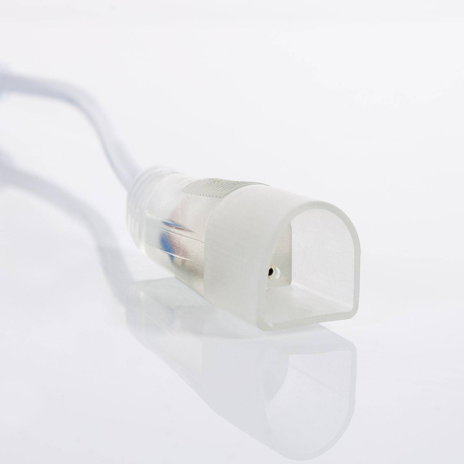 Le câble se connecte directement à l'extrémité du néon LED flexible via l'embout semi circulaire visible sur les photos. L'installation est plug and play pour les profils compatibles. Si vous avez un doute sur la compatibilité mécanique, comparez l'embout du câble avec l'extrémité de votre ruban néon ou contactez notre support avant la pose.