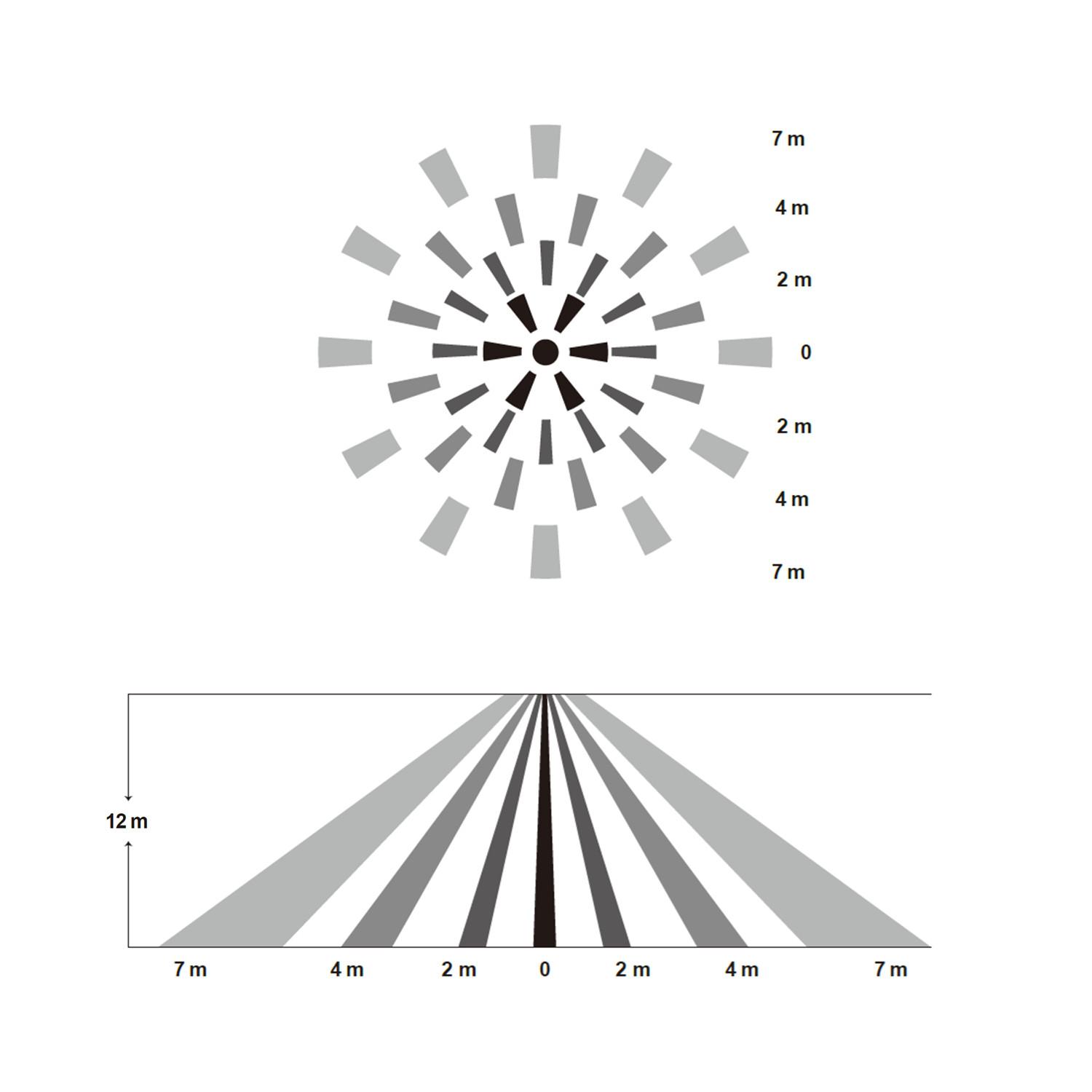 L'appareil intègre des capteurs radar et PIR pour la détection de mouvement. Selon le schéma présent, la zone de détection atteint environ 7 m en rayon en plan horizontal et peut couvrir jusqu'à 12 m en portée longitudinale selon la hauteur et l'angle d'installation. Les réglages de sensibilité et temps peuvent dépendre de la configuration du capteur ou du système de contrôle.