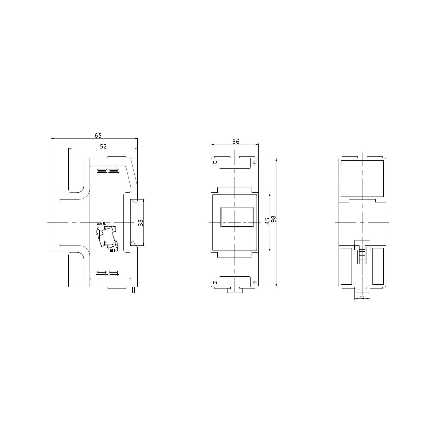 Le produit est adapté à une fixation sur rail DIN et ses dimensions compactes facilitent l'intégration (36 mm de largeur, 65 mm de longueur, 98 mm de hauteur). Montez le compteur sur le rail, connectez la phase et le neutre aux bornes indiquées et placez-le conformément au schéma entre les protections appropriées. L'installation doit être réalisée par un électricien qualifié pour respecter les normes de sécurité.