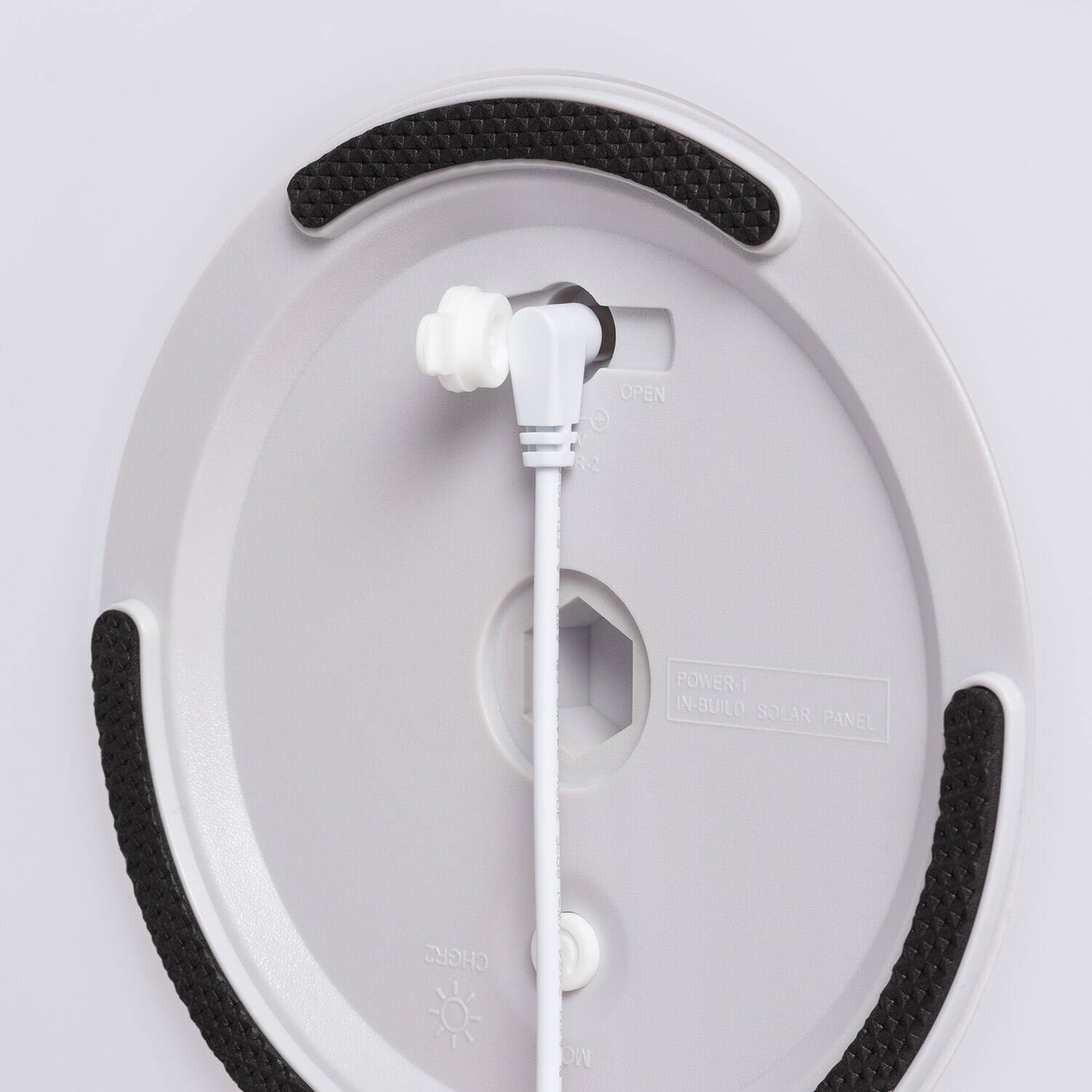 Lampe rechargeable sans fil, elle propose 7 à 8 heures d’autonomie avec sa batterie intégrée. La recharge complète se fait en environ 5 heures par USB ou en environ 15 heures par panneau solaire interne. Un capteur de luminosité automatise la charge et l’allumage suivant l’exposition.