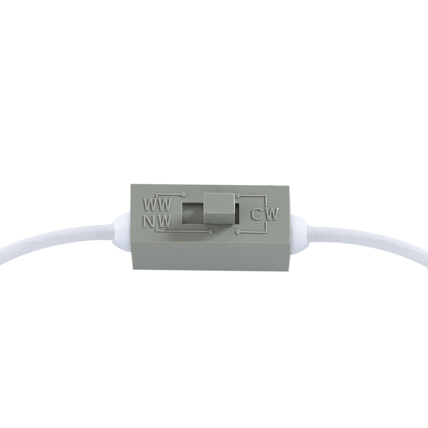 Le réglage CCT se fait via un interrupteur mécanique situé sur le câble du produit visible sur les photos. Il suffit de positionner le commutateur sur l'une des trois positions pour obtenir la lumière chaude, neutre ou froide avant mise en service. La dalle n'intègre pas de contrôle WiFi ni de gradation électronique intégrée.