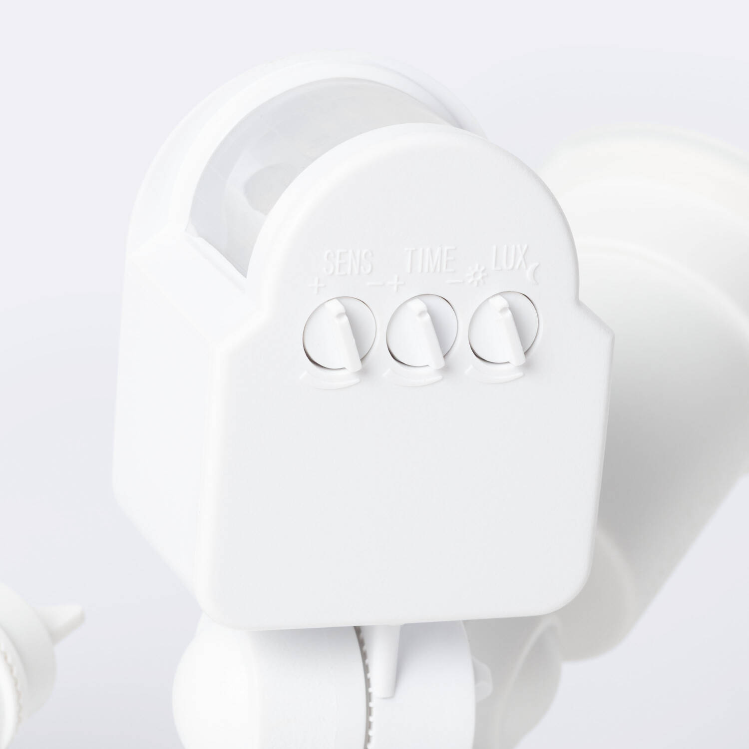 Le bloc de réglages visible comprend trois boutons pour personnaliser le fonctionnement du détecteur. Vous pouvez régler la sensibilité lumineuse (plage 10 Lux à 2000 Lux), la sensibilité de détection et la durée d'éclairage après détection. La portée de détection peut atteindre 12 m avec un angle de 180 degrés.