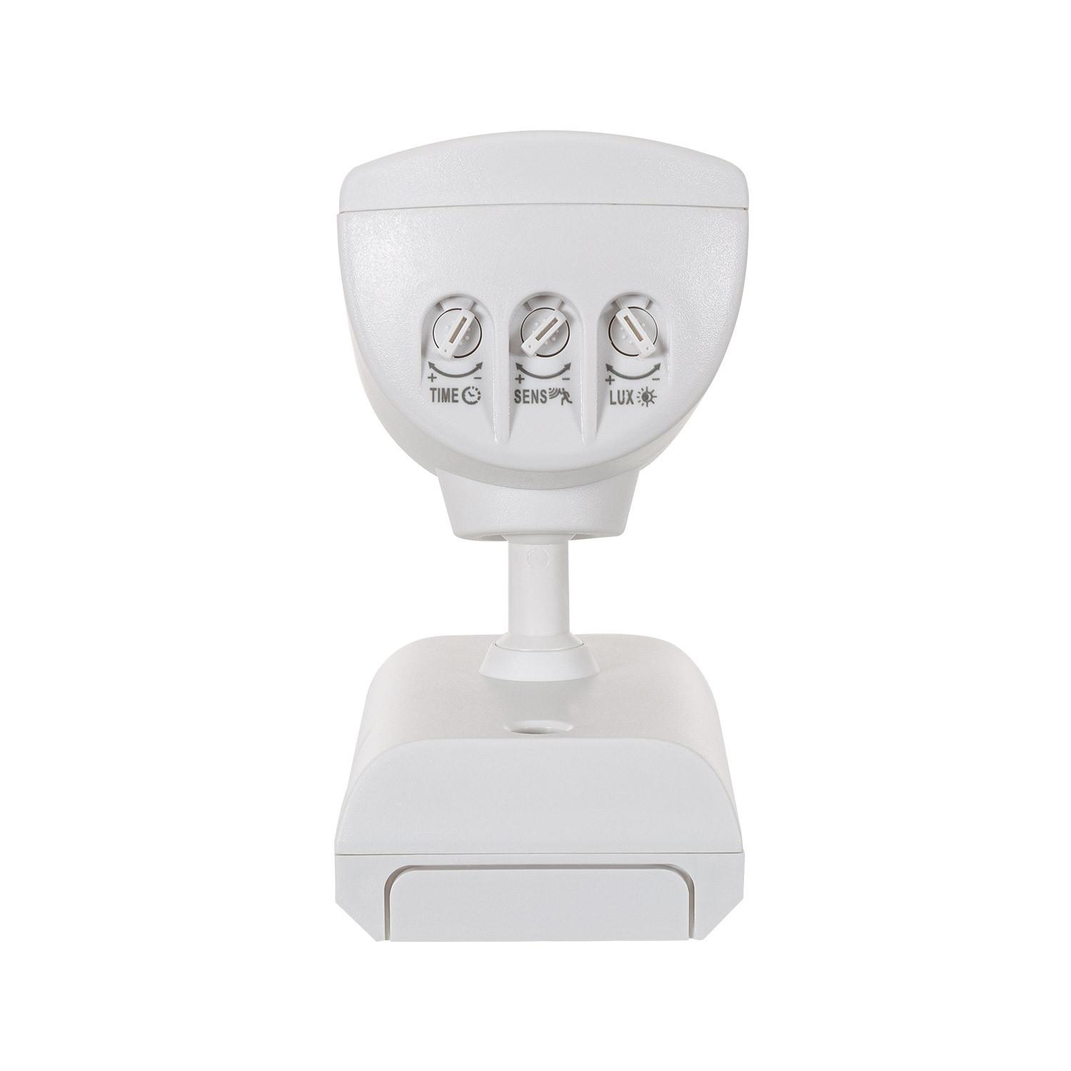 Le produit dispose de trois réglages accessibles depuis l'arrière du boîtier visibles sur les images. Ajustez la sensibilité lumineuse de 10 Lux à 2000 Lux pour définir l'activation selon la luminosité ambiante, réglez la durée d'allumage via le potentiomètre time et ajustez la portée et la réactivité avec le réglage sensibilité. La portée maximale indiquée est de 18 m avec un angle de détection de 120 °.