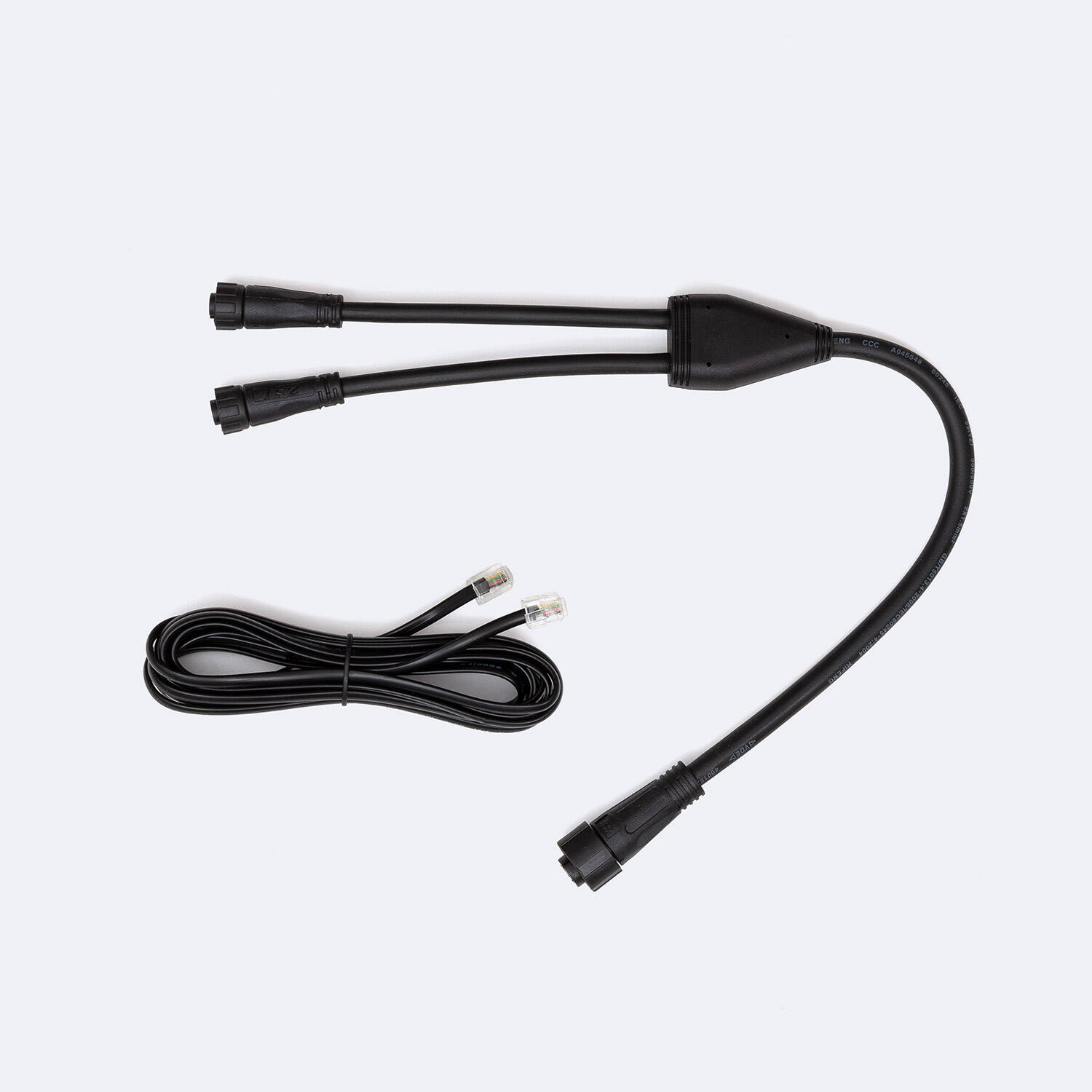 Les images montrent un cordon secteur avec prise, un câble en Y et des connecteurs pour l'alimentation des LED ainsi que des supports de fixation. Les éléments visibles facilitent le raccordement et la fixation. Vérifiez le contenu exact de la boîte lors de la réception pour confirmer les accessoires inclus avec votre exemplaire.