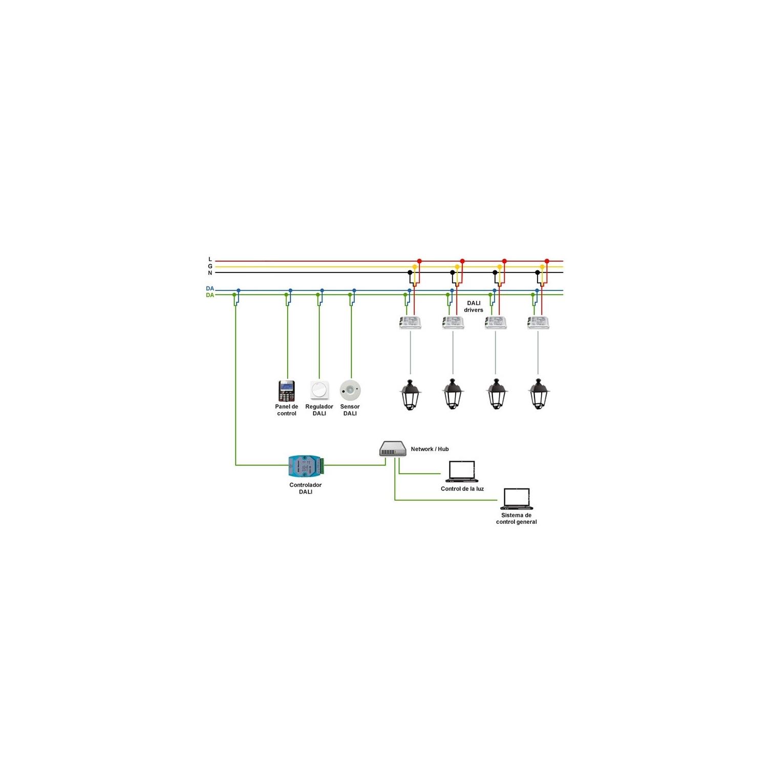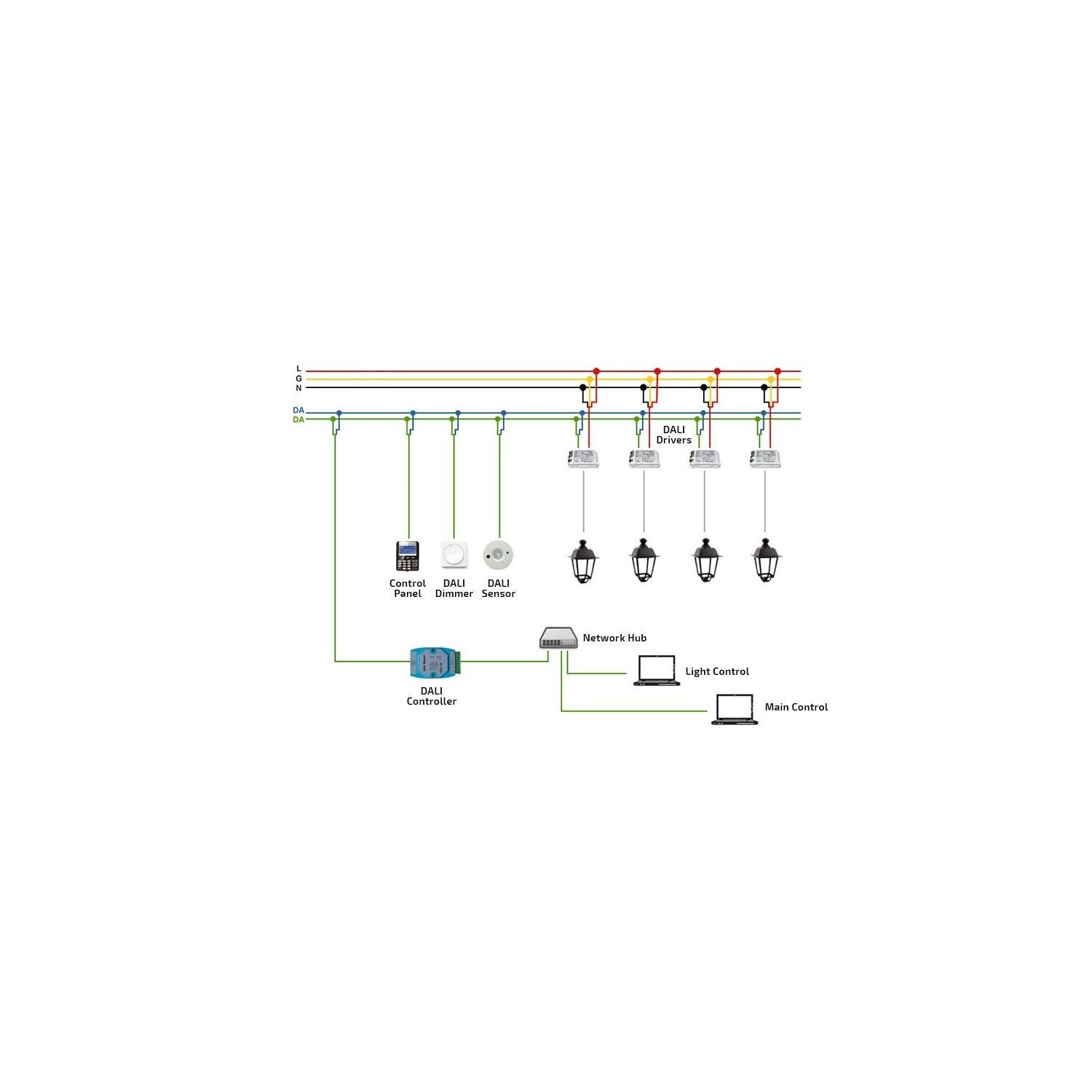 Ce driver est compatible avec le protocole DALI standard et se commande via un contrôleur DALI ou un bus DALI existant. Il faut raccorder le driver au bus DALI selon le schéma et utiliser un contrôleur pour l'adressage, les scènes et la gestion de groupes.