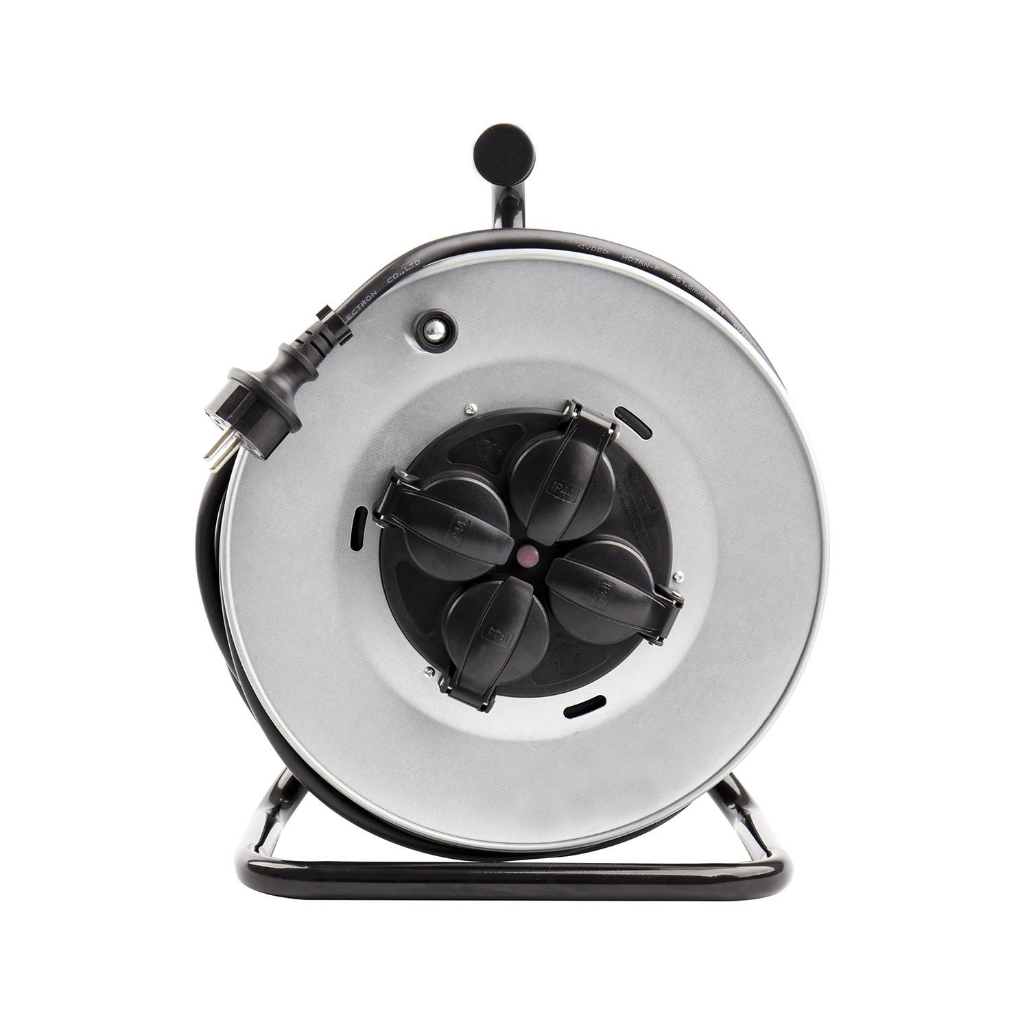 Le déroulement fluide et la bobine bien équilibrée rendent l’utilisation quotidienne très simple. Quatre prises protégées avec capot individuel permettent de brancher plusieurs appareils simultanément, tandis que le mécanisme d’enroulement et l’ergonomie de la poignée garantissent un enroulage précis et sans effort.