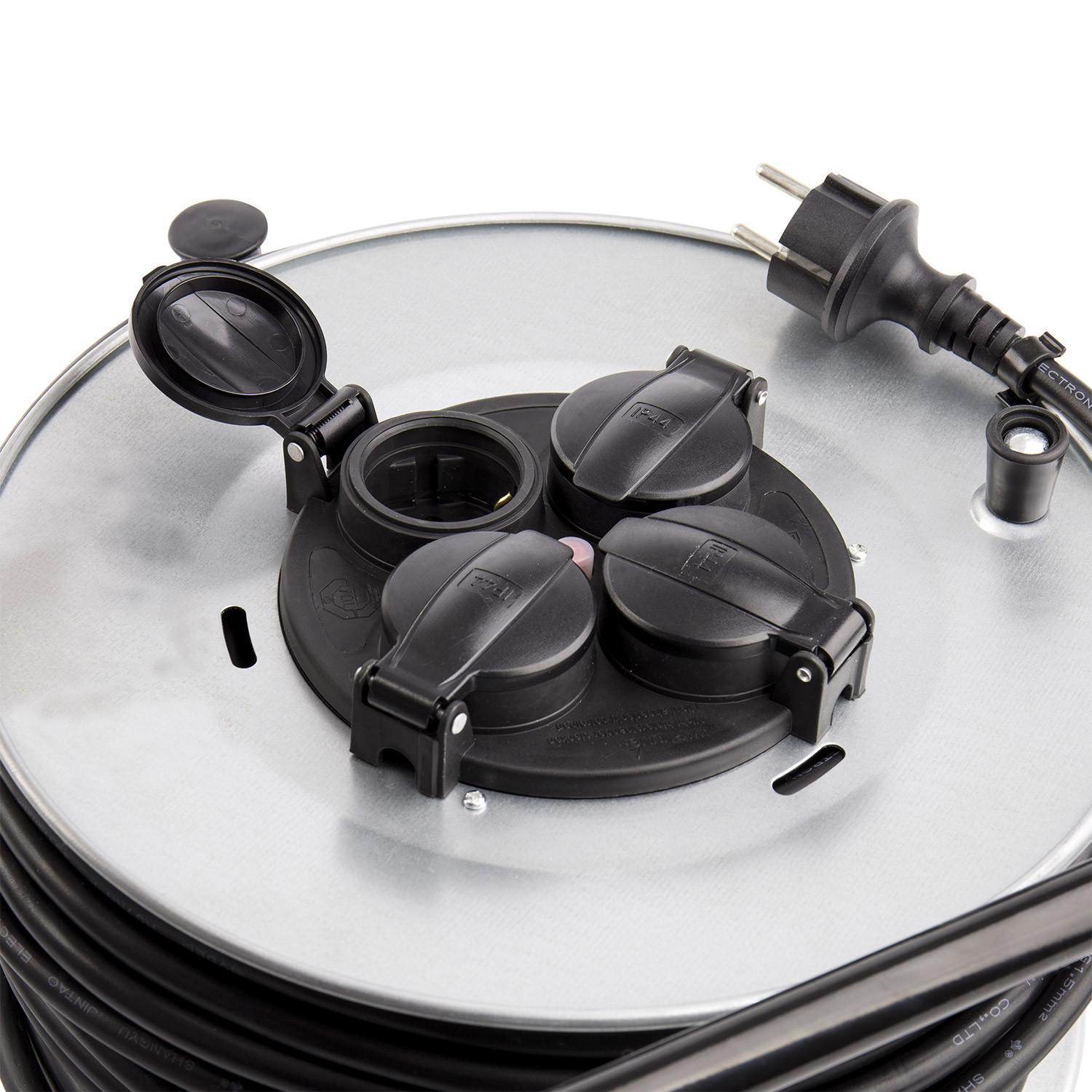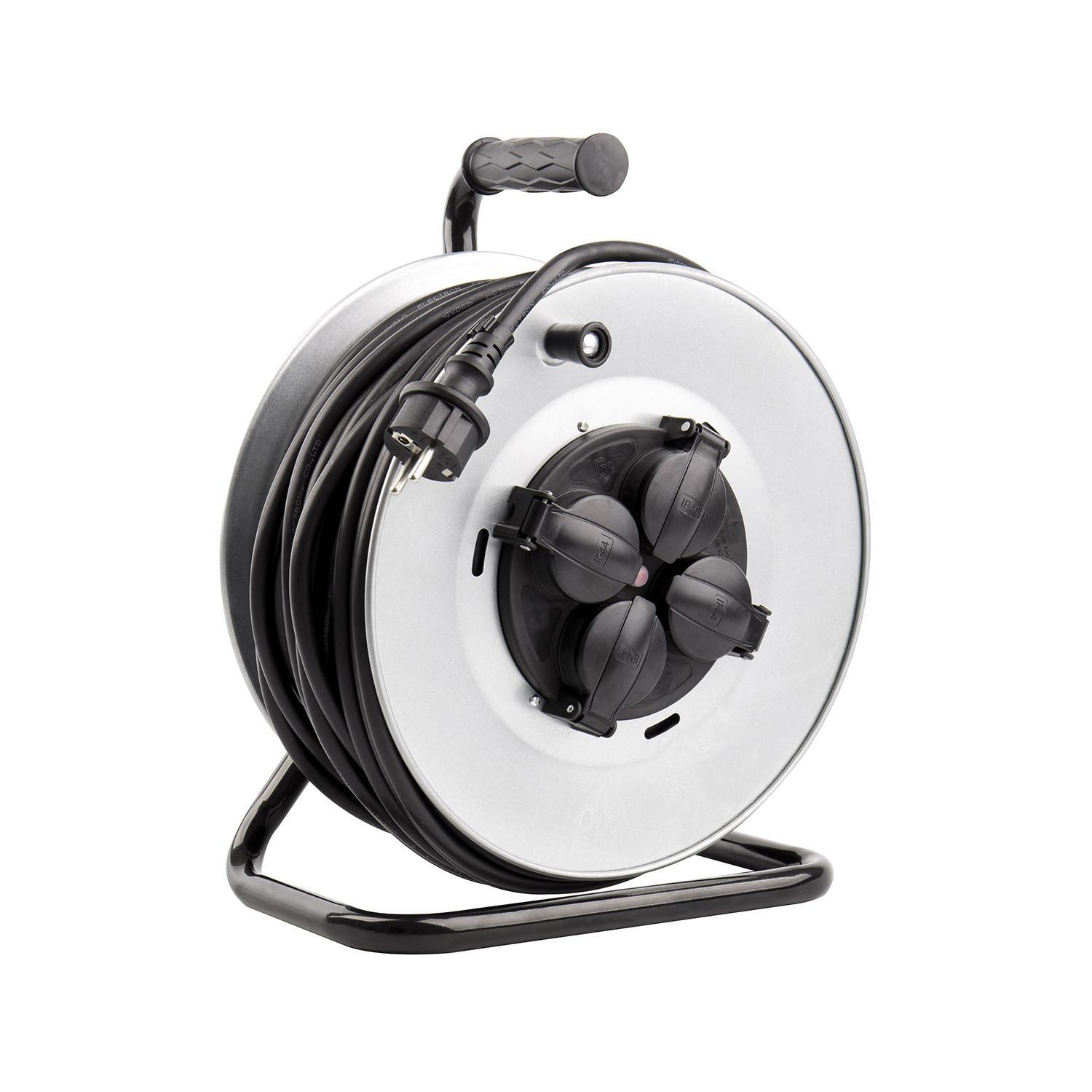 Enrouleur extensible 50 m pour extérieur et intérieur, idéal pour alimenter facilement outils, luminaires et appareils grâce à ses 4 prises protégées. Son câble 3×1,5 mm² IP44 offre une utilisation fiable en environnement humide, avec puissance jusqu’à 3200 W et structure robuste sur support métallique.