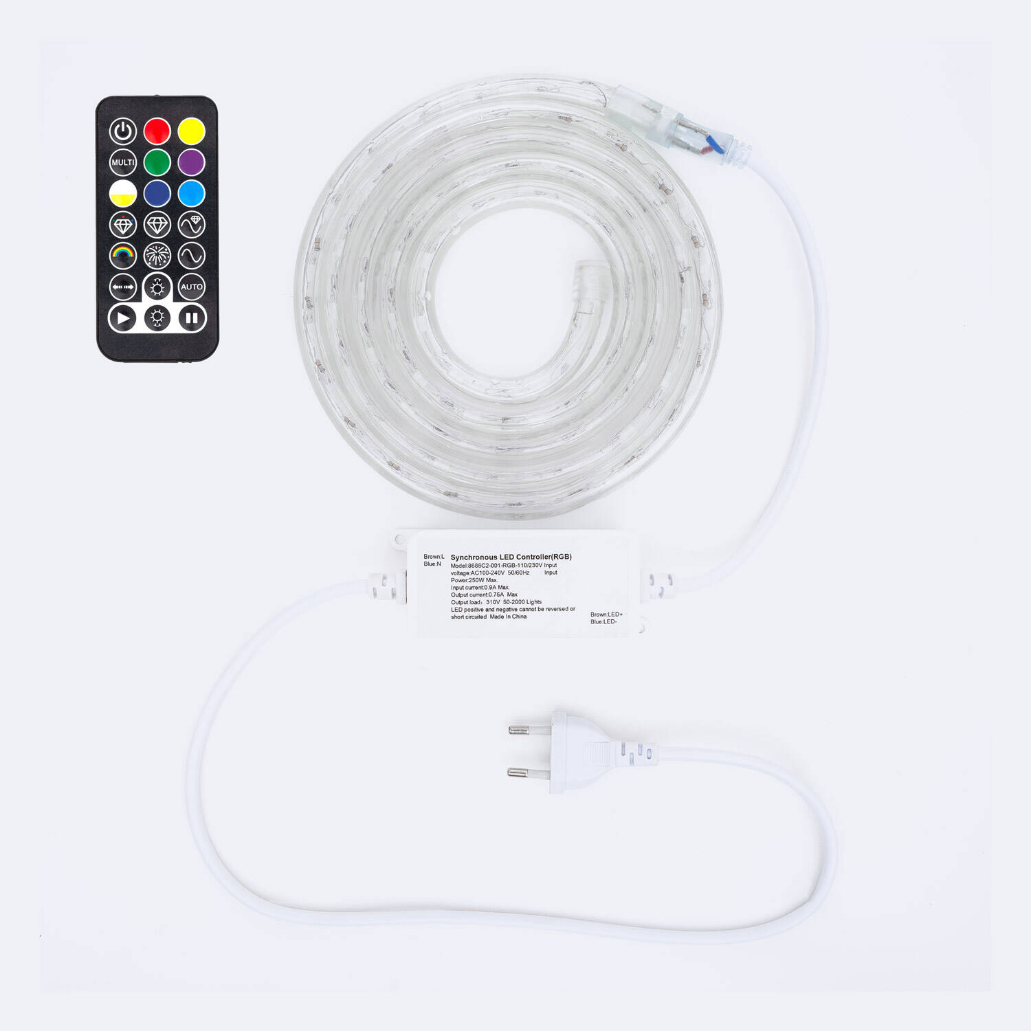 La gaine fonctionne sur 220-240V AC 50-60 Hz et inclut le redresseur nécessaire pour la connexion au réseau. Un contrôleur/télécommande visible sur les images permet de sélectionner les couleurs RGB. Il n'y a pas de module WiFi intégré, la commande se fait localement via la télécommande fournie ou un contrôleur filaire compatible.
