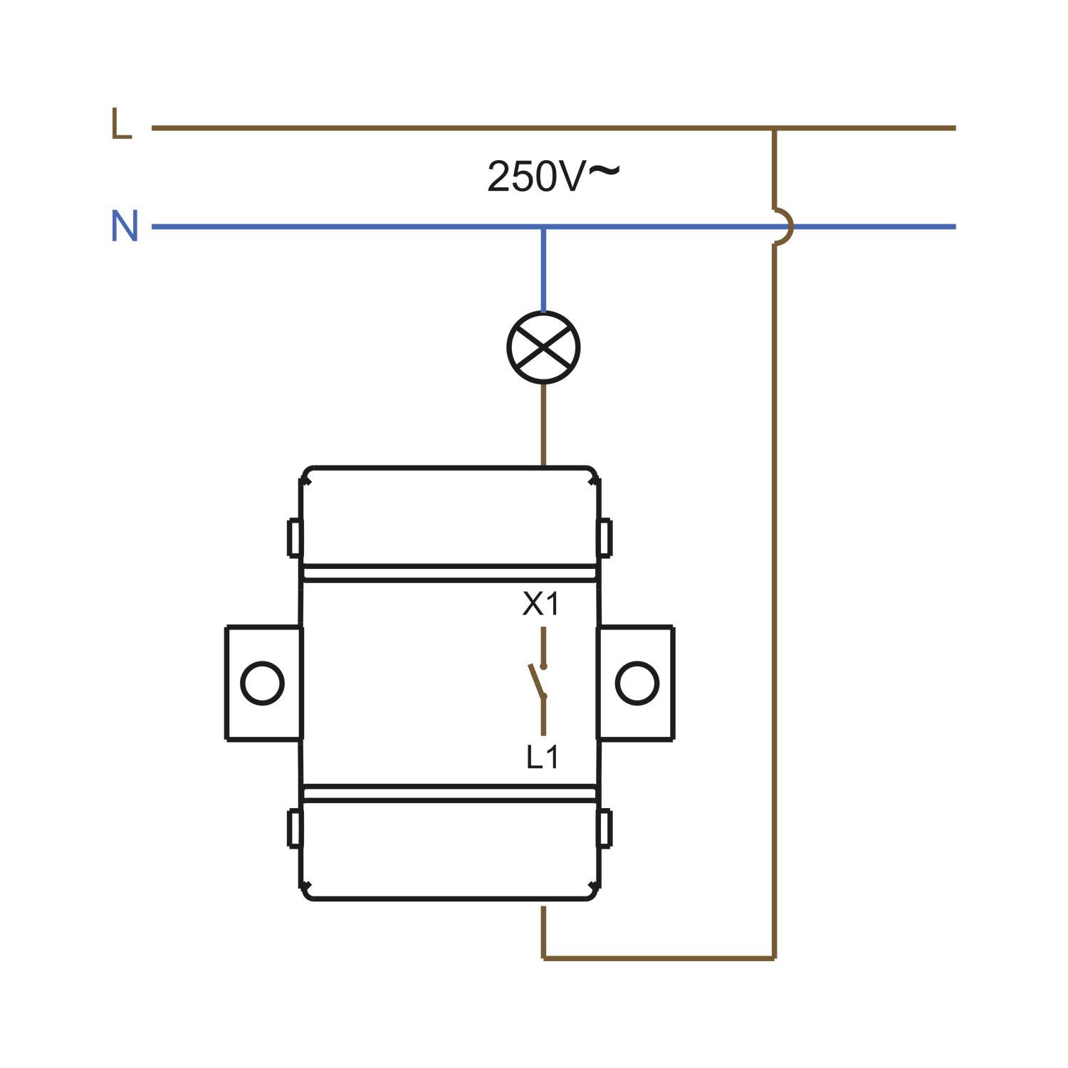 Ce commutateur coupe la phase. Raccordez la phase entrante au bornier d'entrée et la phase sortante vers la lampe sur la borne L1 conformément au schéma fourni. Le neutre ne passe pas par l'interrupteur. Serrez correctement les bornes et vérifiez l'isolement avant remise sous tension. Respectez la tension nominale et l'intensité maximale indiquées pour la sécurité.