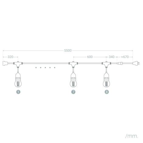 La configuration pratique de 5,5 m et un espacement de 60 cm entre chaque douille facilitent la mise en place et l’équilibrage visuel. Les connecteurs aux extrémités permettent l’alimentation ou l’enchaînement jusqu’à six guirlandes, pour créer des installations personnalisées jusqu’à 30 mètres.