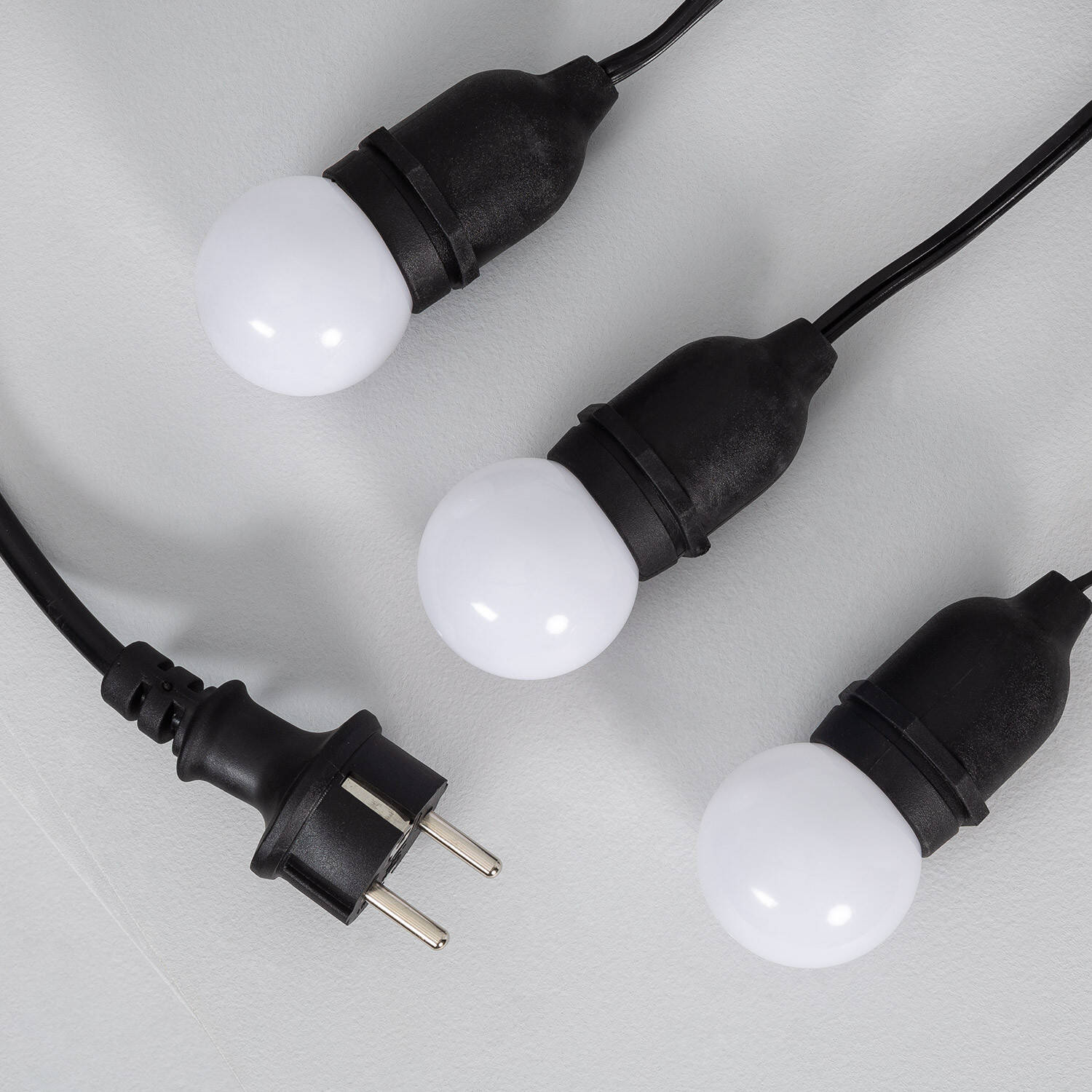Le kit guirlande waterproof 5,5 m noire avec 8 ampoules LED E27 G45 3W diffuse une lumière blanche idéale pour créer une ambiance soignée en extérieur. Robuste et étanche IP65, cette guirlande guinguette extérieure convient parfaitement aux terrasses, jardins et pergolas, avec ampoules remplaçables incluses.
