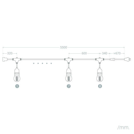 La longueur totale est de 5,5 m avec 8 points de lumière répartis. Pour une installation propre et sécurisée, suspendre la guirlande à l'aide de crochets ou attaches adaptés au câble, veiller à laisser la prise accessible et éviter de tendre excessivement le cordon. Respecter la tension 220-240V et débrancher avant toute manipulation.