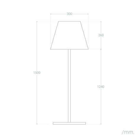 Avec un poids de 2,65 kg et une base de 300 mm, le lampadaire offre une bonne stabilité pour une terrasse ou un balcon. Pour des emplacements très exposés au vent, nous recommandons de le placer près d'un mur ou d'un meuble lourd ou d'ajouter une fixation supplémentaire si nécessaire.