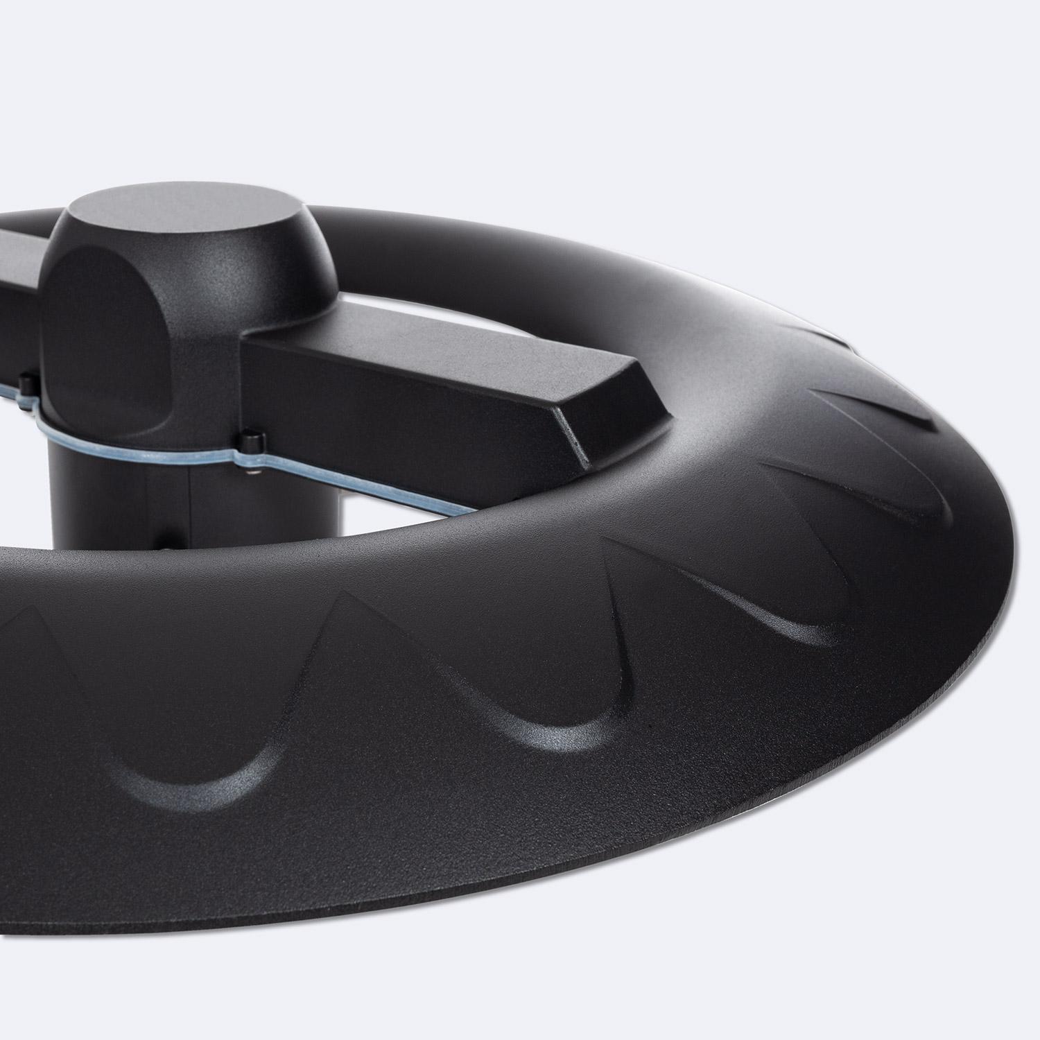 Son esthétisme circulaire, finition grise et lignes épurées offrent une présence contemporaine sans surcharge visuelle. Le profil discret et la surface texturée s’harmonisent avec les mobiliers urbains, valorisant les projets paysagers tout en conservant une silhouette technique et durable dans le temps.