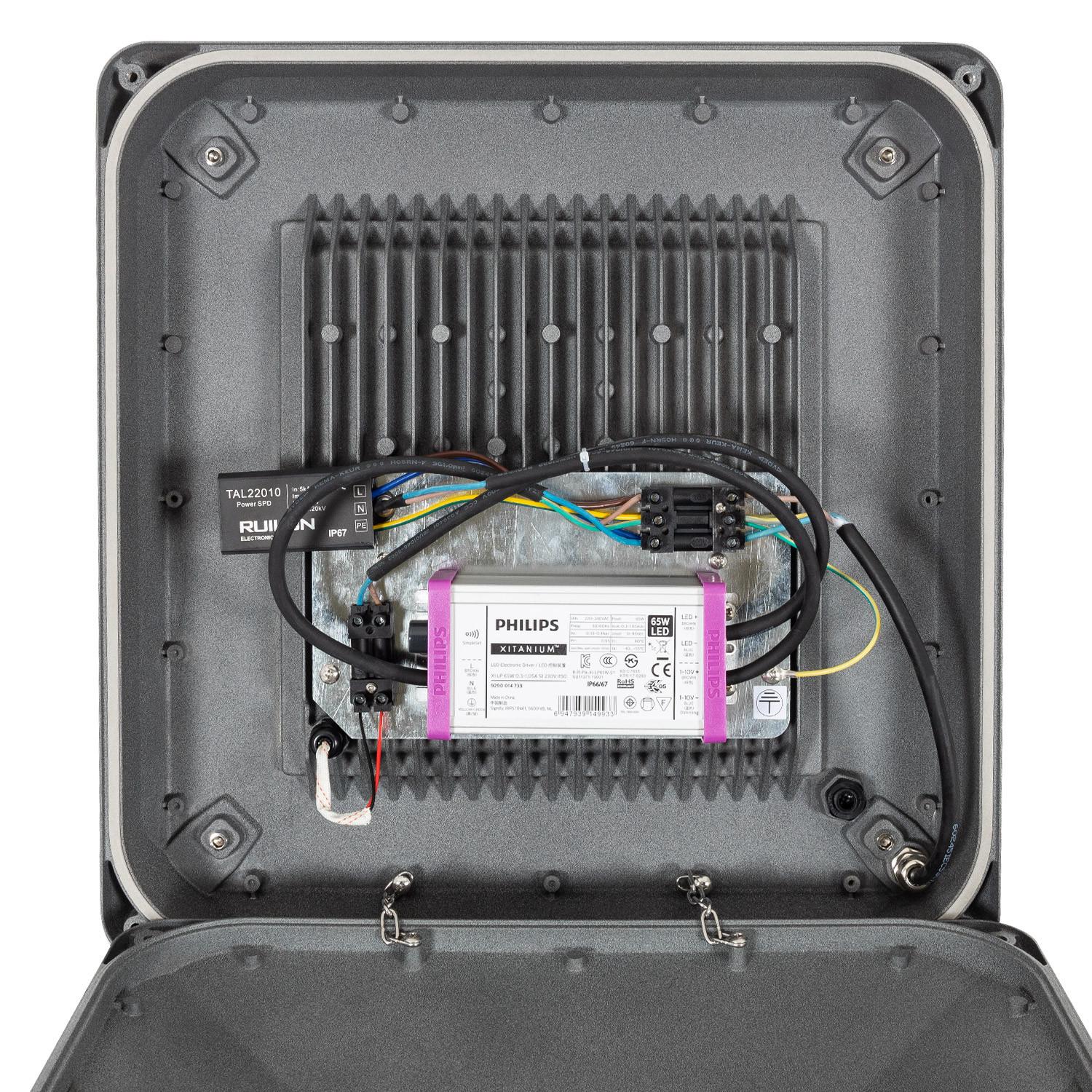L’Aventino Square intègre un driver PHILIPS Xitanium remplaçable, conçu pour l’éclairage public et protégé contre surtensions et surchauffes. La source est remplaçable, facilitant l’entretien sur site, et la compatibilité 100–240 V simplifie l’installation sur réseaux municipaux variés, garantissant une disponibilité d’éclairage maximale.