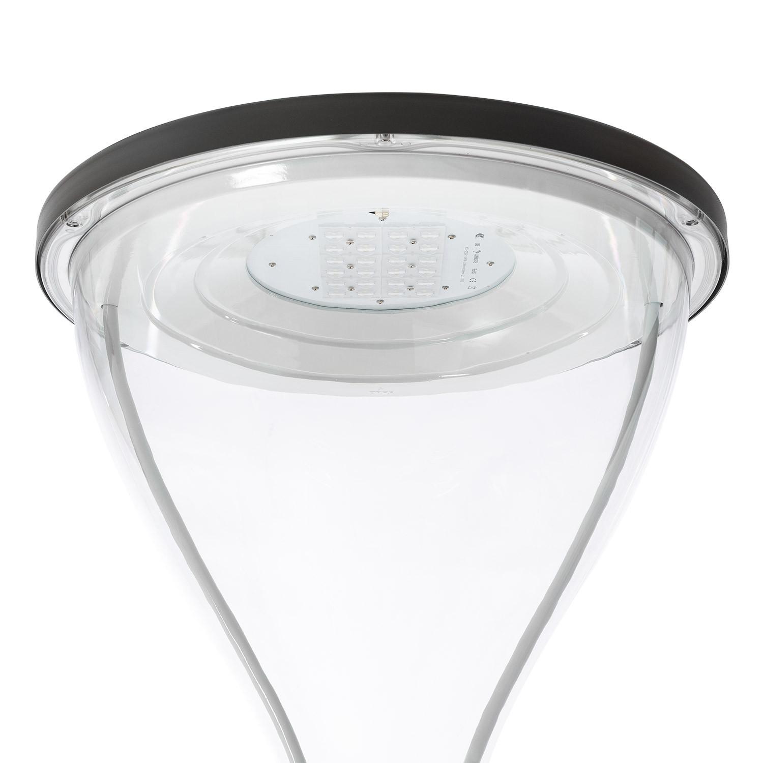Le lampadaire délivre 5 400 lm pour une puissance de 40 W, avec une température de couleur blanc chaud 2 700 K et un rendu colorimétrique IRC 80. La performance LED annoncée est 145 lm/W et le rendement 135 lm/W, pour une durée de vie estimée à 100 000 heures, ce qui en fait une solution efficace pour l'éclairage public et extérieur.