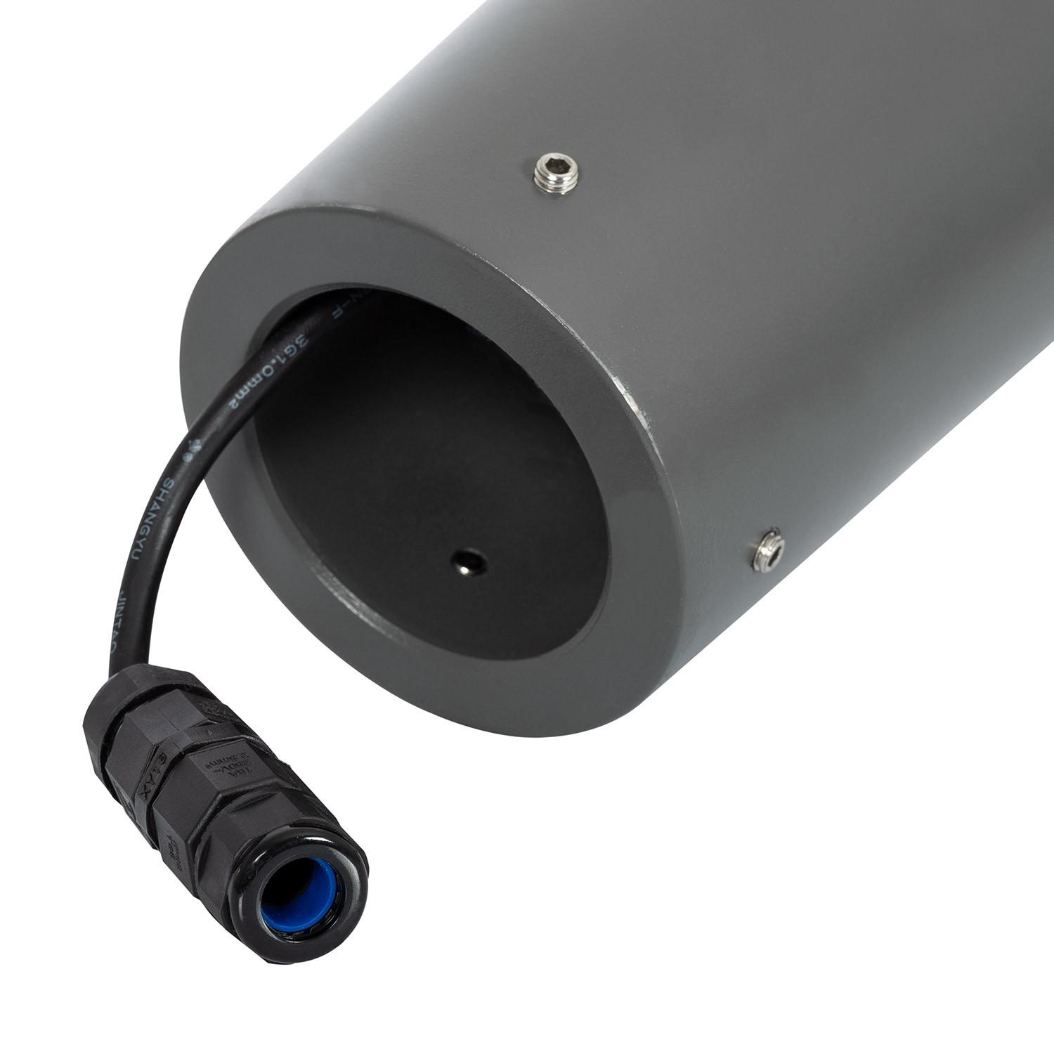 Le corps aux lignes contemporaines combine aluminium moulé par injection et composants en polycarbonate pour un rendu haut de gamme. La charnière intérieure et la finition anti-UV préservent l’esthétique, tandis que l’implantation sur mât offre une silhouette discrète parfaitement intégrée aux espaces publics.