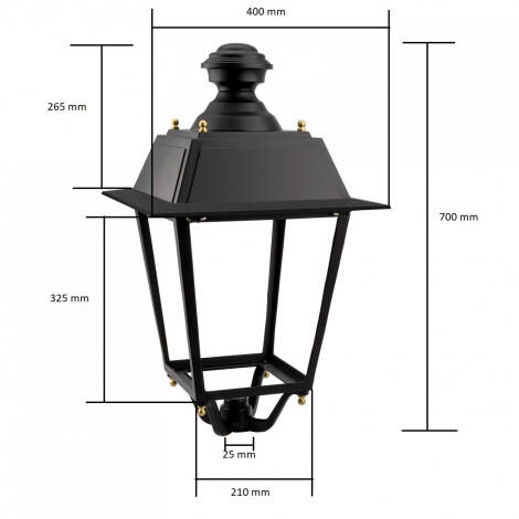 Conçu pour une installation simple, le luminaire s’adapte aux colonnes courantes avec un support acceptant Ø75–Ø80 mm; retiré, il laisse un trou Ø25 mm compatible pour fixation murale. La large plage de tension garantit une compatibilité réseau raffinée et fiable pour l’usage extérieur.