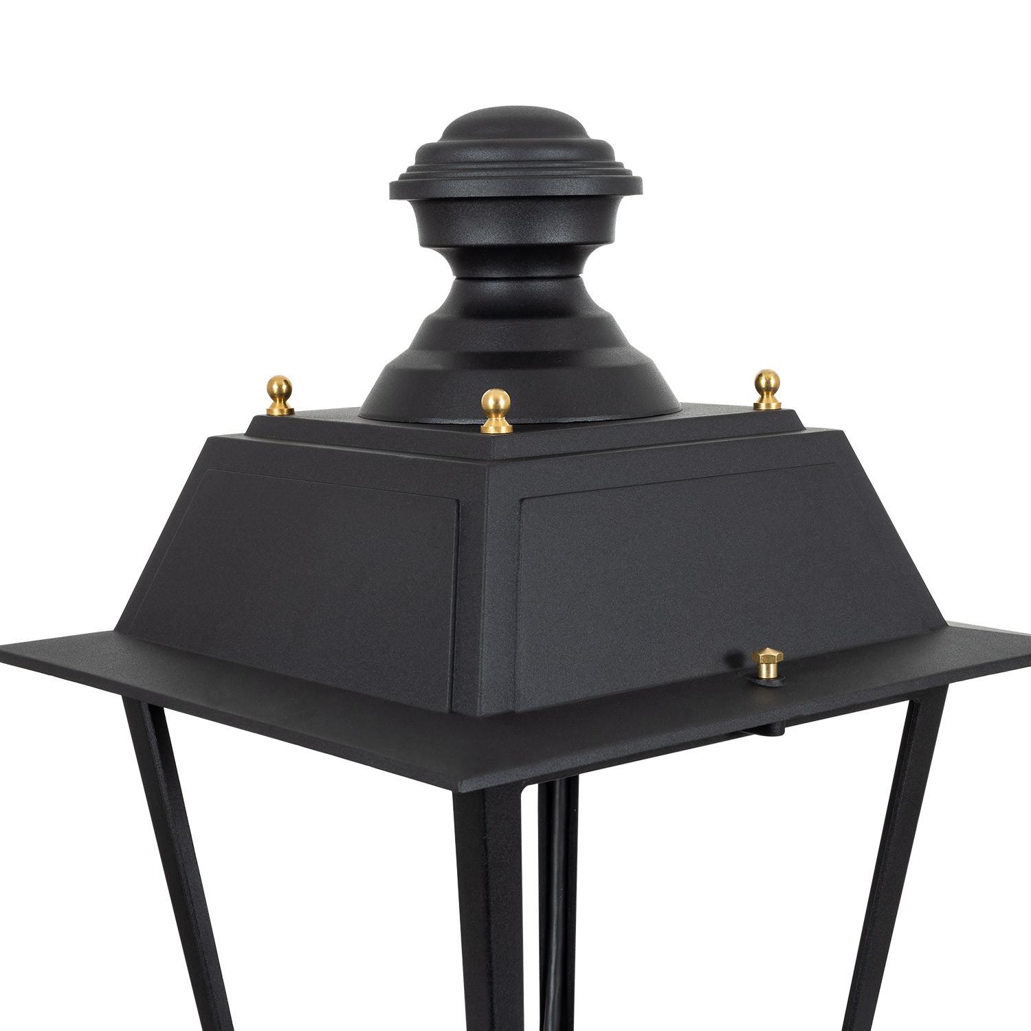 Le lampadaire affiche une finition noire RAL 9011 et un design inspiré des lanternes classiques, parfaitement adapté aux espaces patrimoniaux ou contemporains. Ses proportions soignées et son aspect compact s’harmonisent sur voies, allées et jardins, apportant une présence lumineuse discrète mais affirmée.