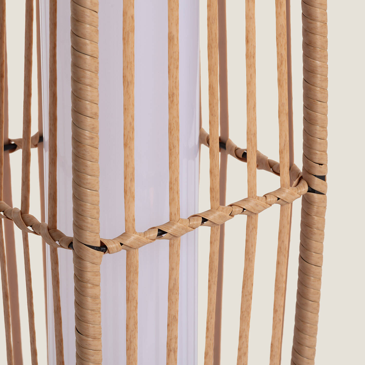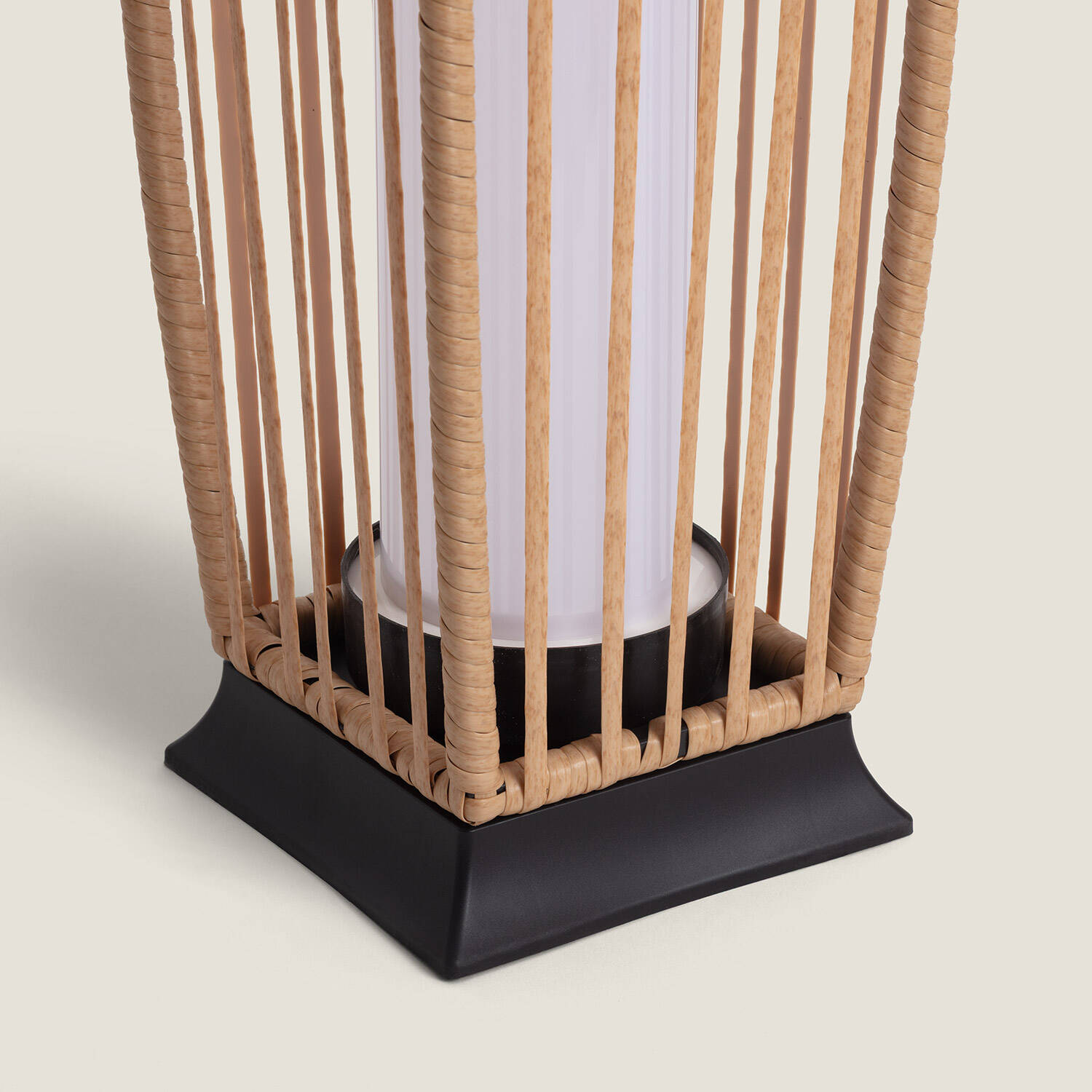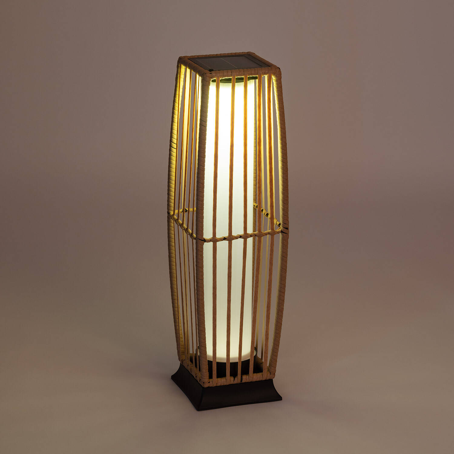 Son habillage en rotin synthétique reproduit l’allure du rotin naturel tout en offrant une résistance supérieure aux intempéries. Le panneau solaire intégré reste discret sur le sommet, préservant l’élégance des lignes et apportant une présence raffinée adaptée aux ambiances contemporaines ou plus classiques.