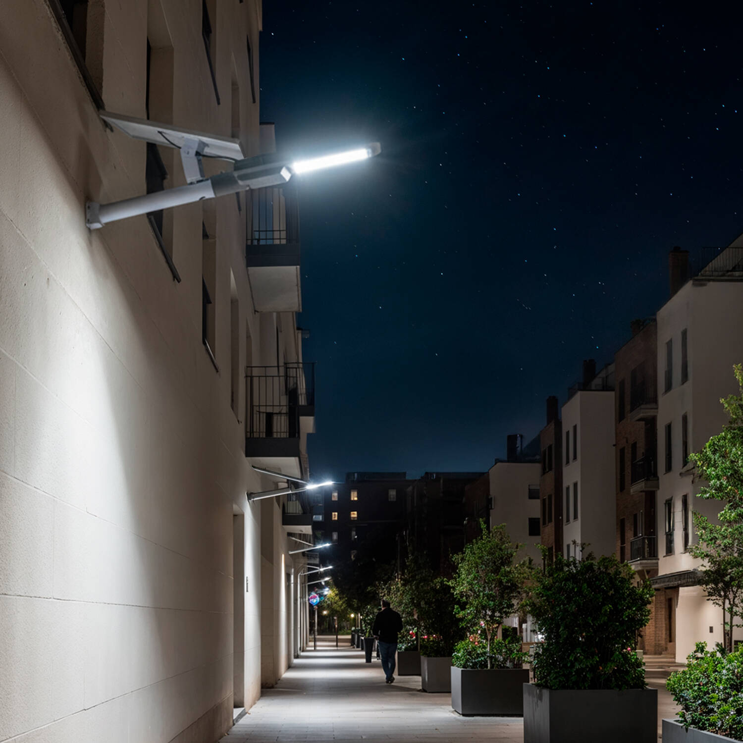 La teinte blanc neutre 4000K restitue une lumière naturelle qui favorise la visibilité et le confort visuel des usagers. En éclairant uniformément trottoirs et voies, ce lampadaire participe à la sécurité urbaine en améliorant la perception des obstacles tout en préservant une ambiance agréable.