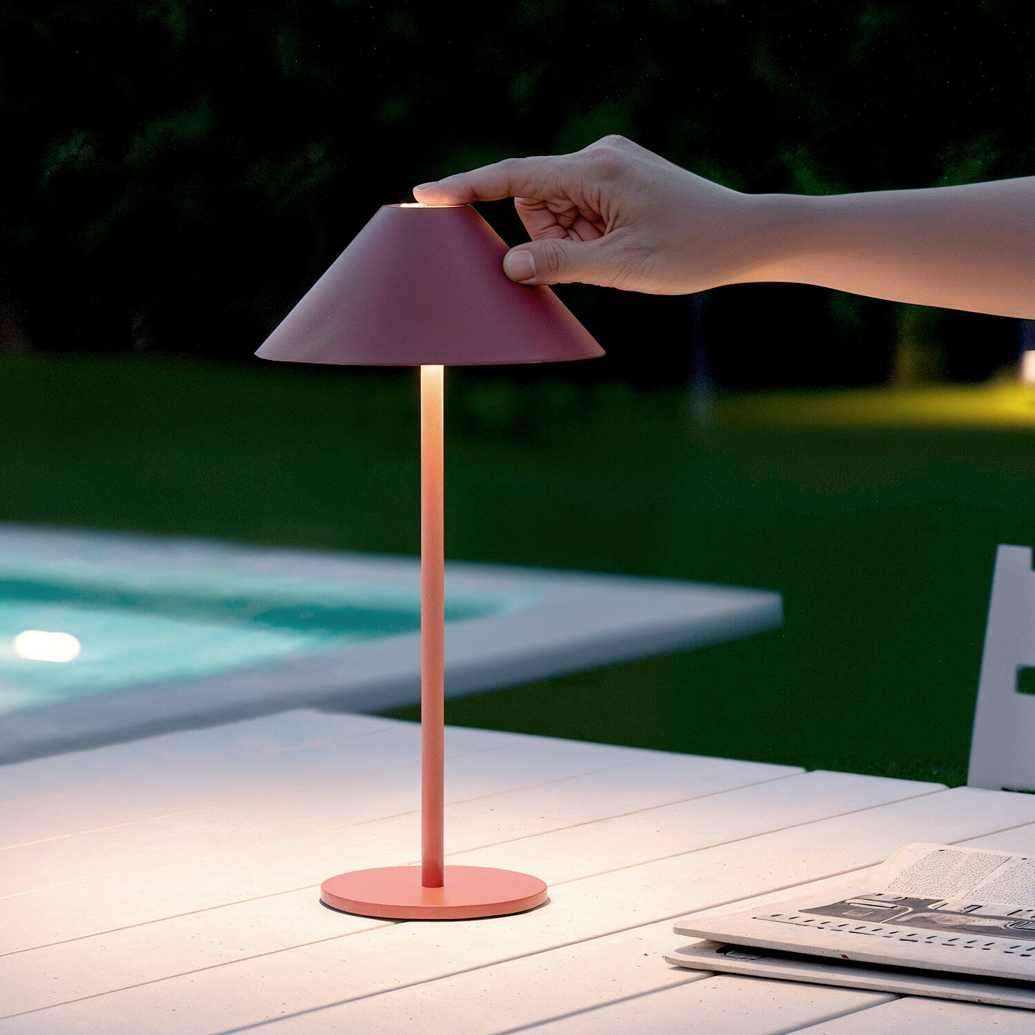 La lampe à poser LED portable extérieure Kivuli en terre cuite séduit par son design épuré en métal et sa silhouette contemporaine. Rechargeable par USB-C, sans fil et dimmable par commande tactile, elle diffuse une lumière blanc chaud idéale pour une table de terrasse, un balcon ou un espace repas intérieur comme extérieur.
