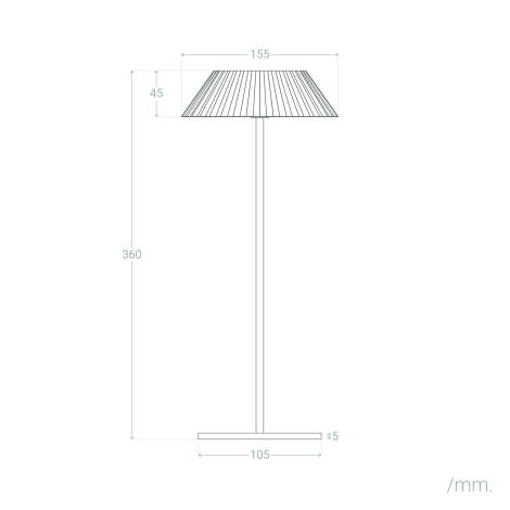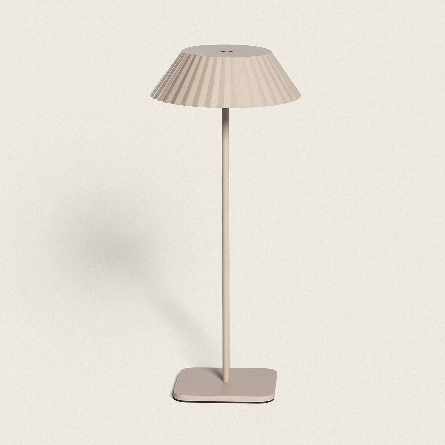 Un esthétisme sobre et soigné se révèle dans ses proportions compactes. La structure métallique couleur beige et l’abat‑jour plissé apportent une silhouette élégante, tandis que la base au format réduit et la hauteur maîtrisée s’intègrent naturellement sur table ou sur une terrasse.
