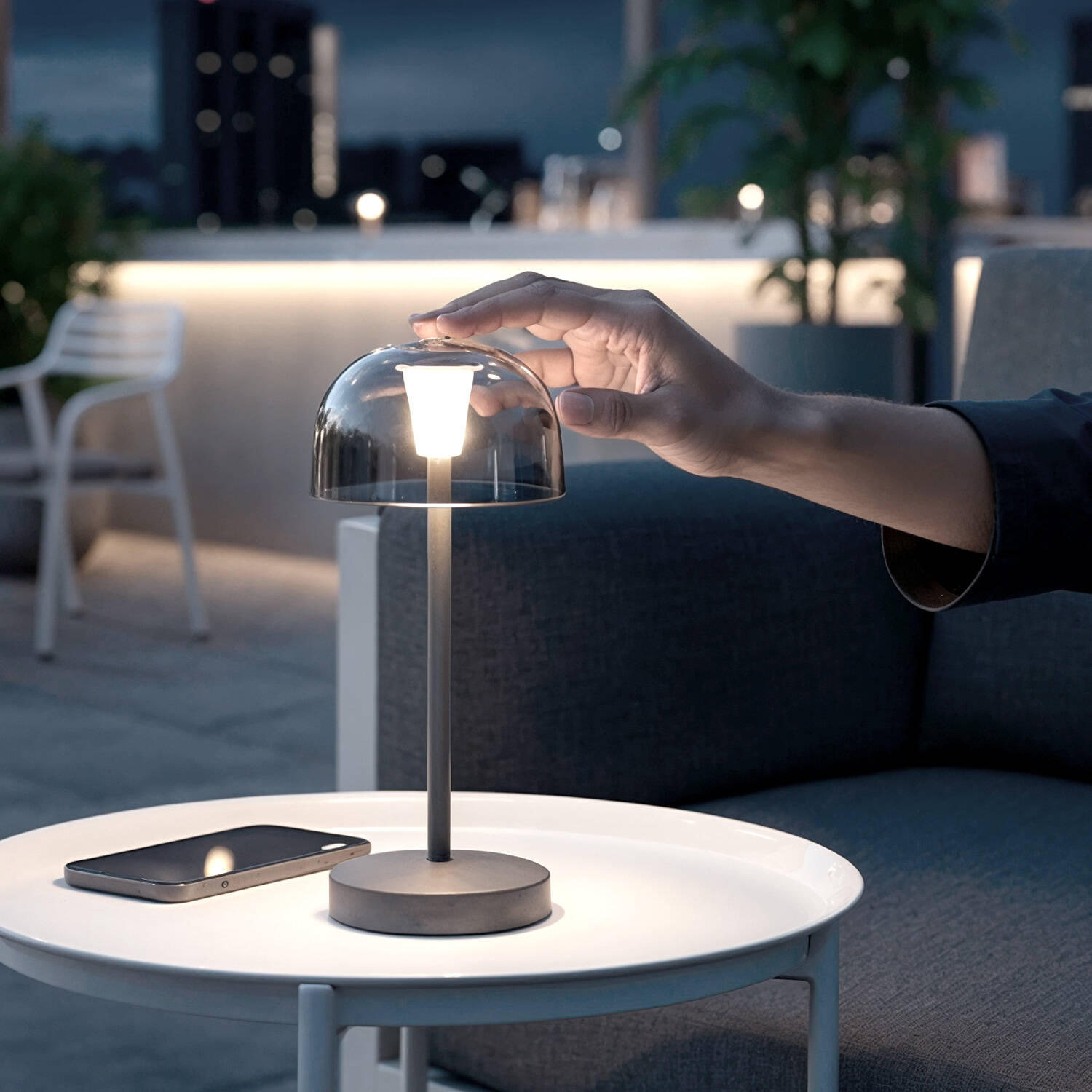 La lampe à poser LED portable pour extérieur Lendora Smoke gris séduit par son design épuré en métal et diffuseur fumé. Sans fil, rechargeable par USB et dimmable par commande tactile, elle offre une lumière blanc chaud idéale sur une table de terrasse, un balcon ou en intérieur, avec protection IP44.
