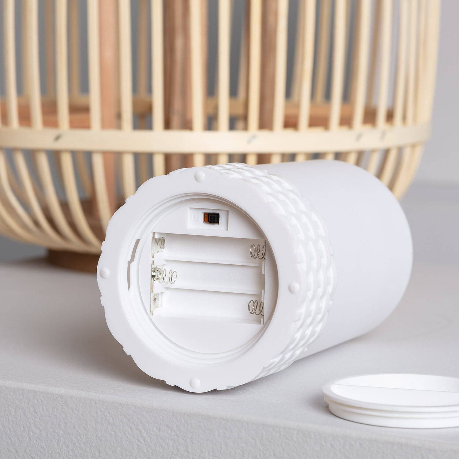 La Lampe à Poser LED Portable Rotin Jávea fonctionne sur piles et ne contient pas de batterie intégrée. Elle nécessite 3 piles AAA LR03 de 1.5 V qui ne sont pas fournies. Le compartiment à piles amovible se voit sur les photos pour un remplacement simple. Pour une autonomie optimale utilisez des piles neuves de qualité et évitez de mélanger piles neuves et anciennes.