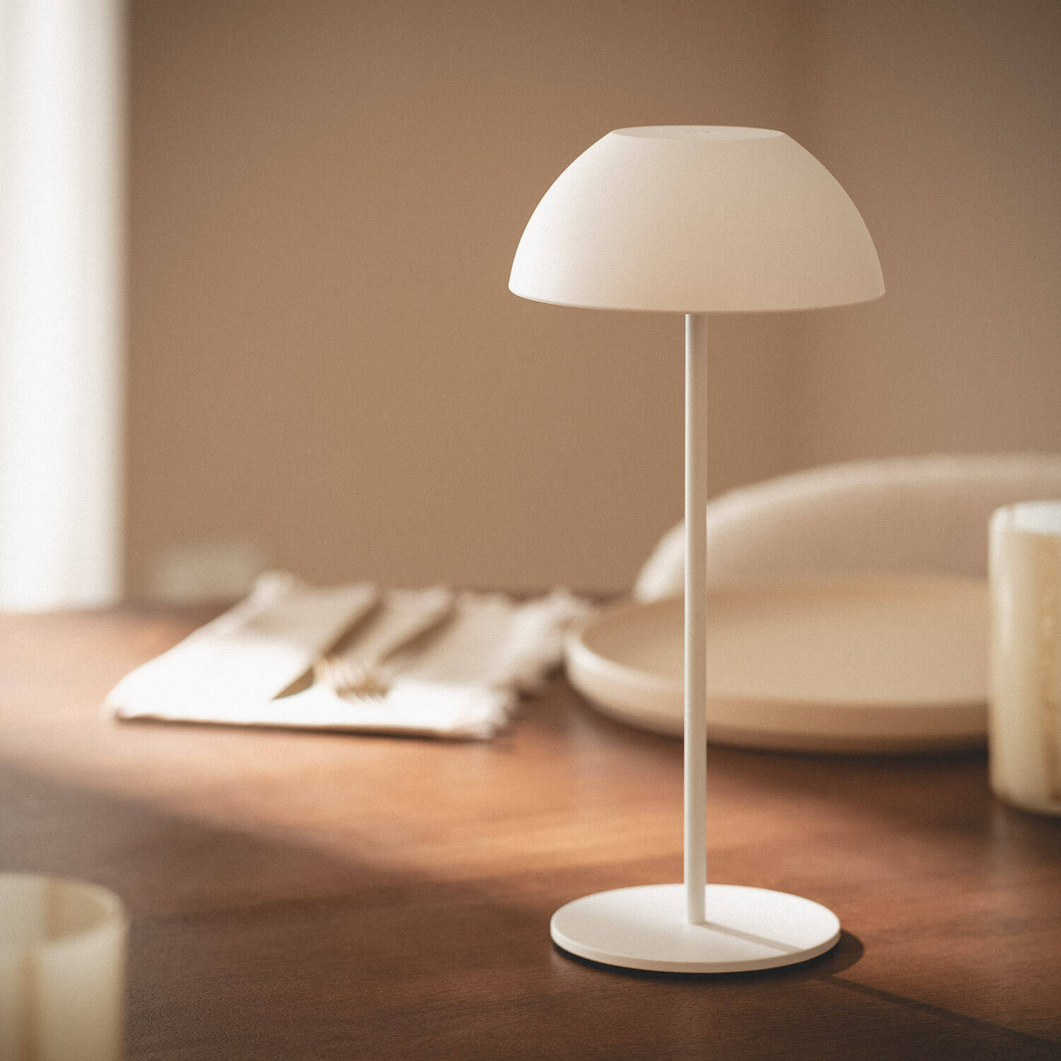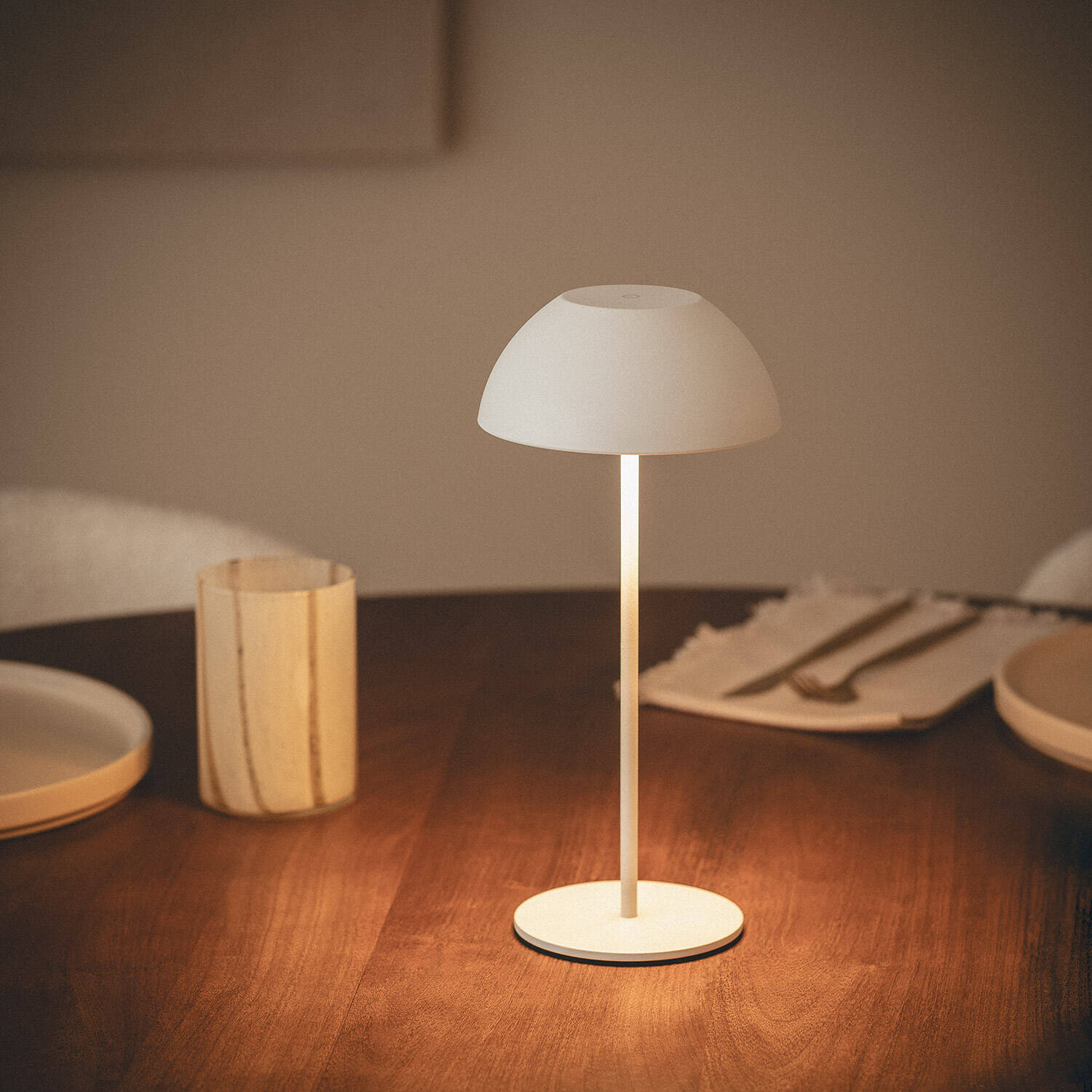 La lampe à poser portable Mugla offre un éclairage sans contrainte, idéale pour intérieur comme extérieur. Sa silhouette compacte (280 mm de haut, 130 mm de diamètre) associe métal et neutralité blanche pour créer une atmosphère chaleureuse, discrète et parfaitement adaptée aux ambiances contemporaines.